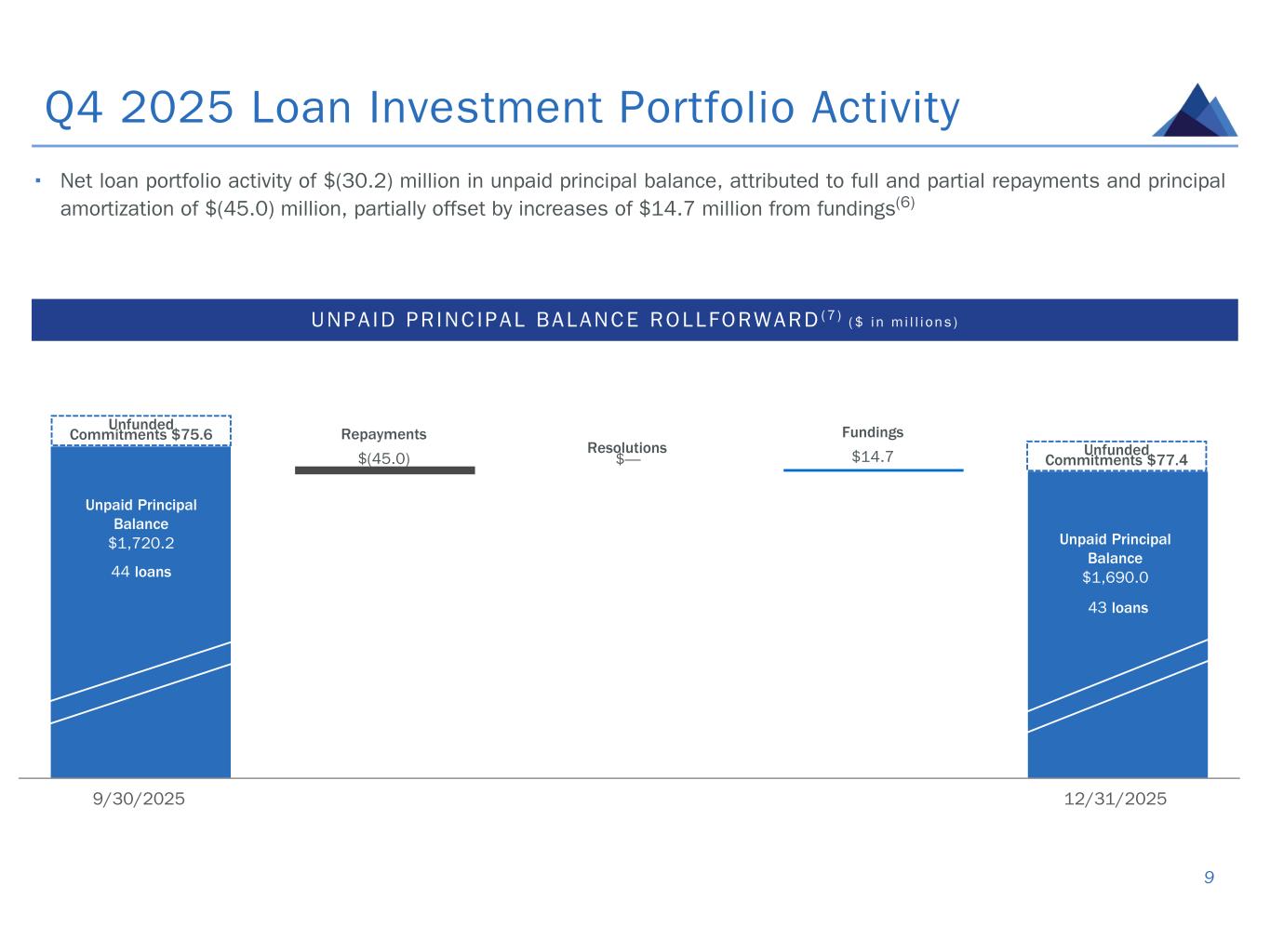$— 9/30/2025 12/31/2025 Q4 2025 Loan Investment Portfolio Activity ▪ Net loan portfolio activity of $(30.2) million in unpaid principal balance, attributed to full and partial repayments and principal amortization of $(45.0) million, partially offset by increases of $14.7 million from fundings(6) 9 UNPAID PR INCIPAL BALANCE ROLLFORWARD (7 ) ($ in mi l l i ons ) Unpaid Principal Balance $1,720.2 44 loans Repayments $(45.0) Fundings $14.7 Unpaid Principal Balance $1,690.0 43 loans Unfunded Commitments $75.6 Unfunded Commitments $77.4 Resolutions