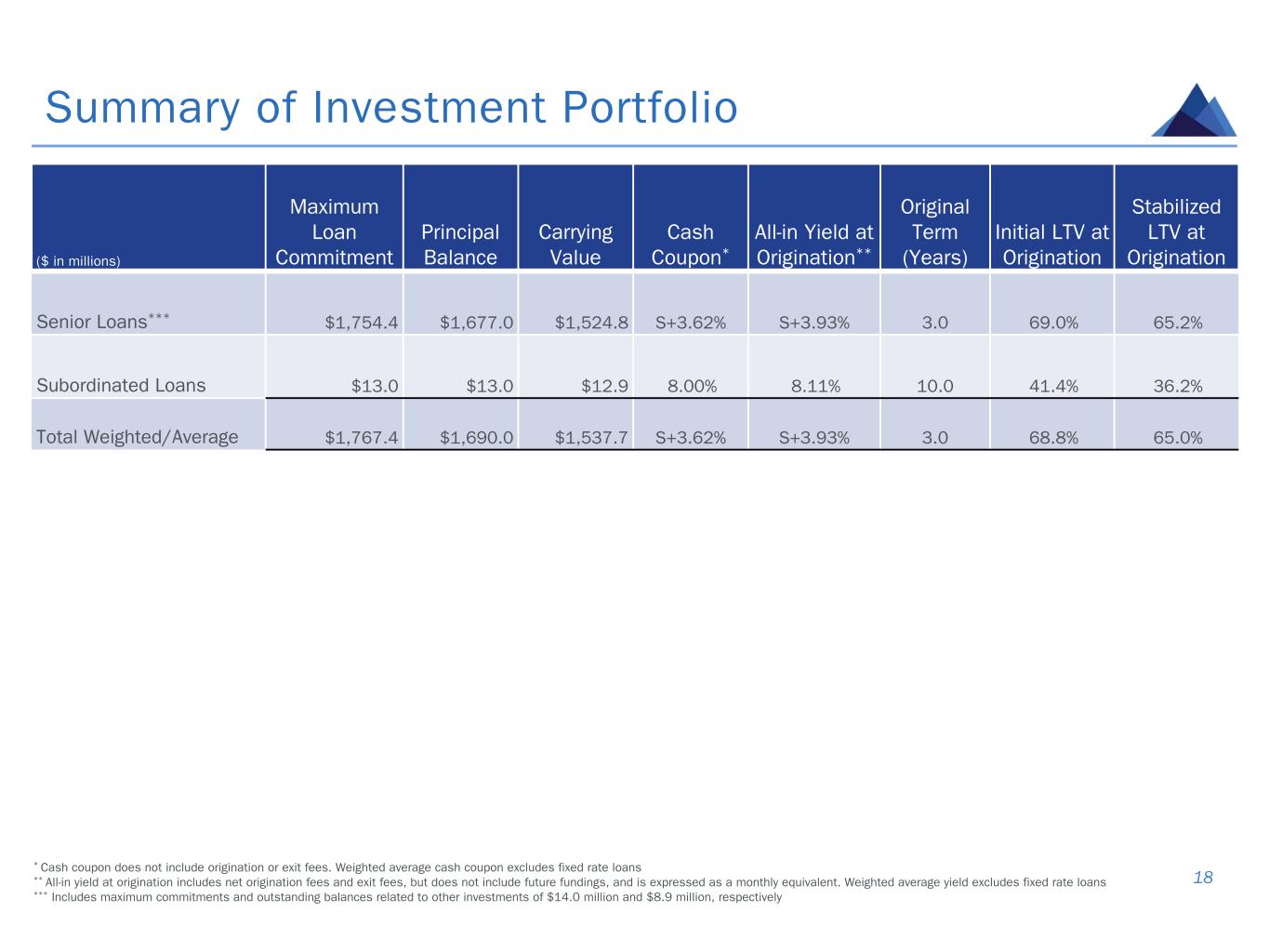 * Cash coupon does not include origination or exit fees. Weighted average cash coupon excludes fixed rate loans ** All-in yield at origination includes net origination fees and exit fees, but does not include future fundings, and is expressed as a monthly equivalent. Weighted average yield excludes fixed rate loans *** Includes maximum commitments and outstanding balances related to other investments of $14.0 million and $8.9 million, respectively Summary of Investment Portfolio 18 ($ in millions) Maximum Loan Commitment Principal Balance Carrying Value Cash Coupon* All-in Yield at Origination** Original Term (Years) Initial LTV at Origination Stabilized LTV at Origination Senior Loans*** $1,754.4 $1,677.0 $1,524.8 S+3.62% S+3.93% 3.0 69.0% 65.2% Subordinated Loans $13.0 $13.0 $12.9 8.00% 8.11% 10.0 41.4% 36.2% Total Weighted/Average $1,767.4 $1,690.0 $1,537.7 S+3.62% S+3.93% 3.0 68.8% 65.0%