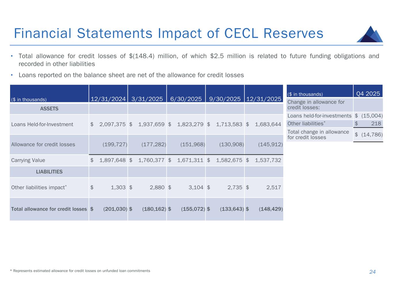 ($ in thousands) 12/31/2024 3/31/2025 6/30/2025 9/30/2025 12/31/2025 ASSETS Loans Held-for-Investment $ 2,097,375 $ 1,937,659 $ 1,823,279 $ 1,713,583 $ 1,683,644 Allowance for credit losses (199,727) (177,282) (151,968) (130,908) (145,912) Carrying Value $ 1,897,648 $ 1,760,377 $ 1,671,311 $ 1,582,675 $ 1,537,732 LIABILITIES Other liabilities impact* $ 1,303 $ 2,880 $ 3,104 $ 2,735 $ 2,517 Total allowance for credit losses $ (201,030) $ (180,162) $ (155,072) $ (133,643) $ (148,429) Financial Statements Impact of CECL Reserves 24 ▪ Total allowance for credit losses of $(148.4) million, of which $2.5 million is related to future funding obligations and recorded in other liabilities ▪ Loans reported on the balance sheet are net of the allowance for credit losses ($ in thousands) Q4 2025 Change in allowance for credit losses: Loans held-for-investments $ (15,004) Other liabilities* $ 218 Total change in allowance for credit losses $ (14,786) * Represents estimated allowance for credit losses on unfunded loan commitments