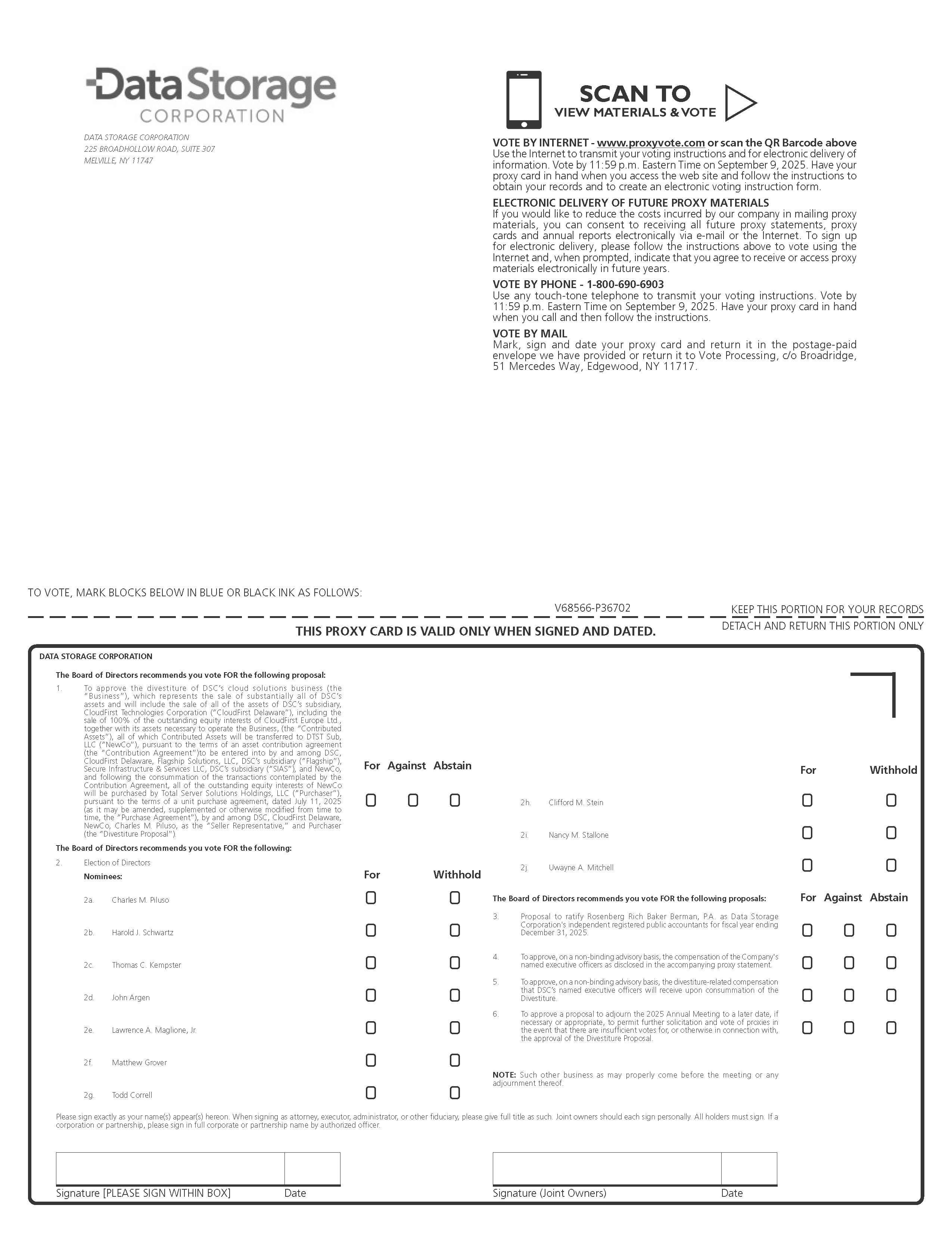 You will also be asked to consider and vote on a proposal to: (1) elect each of the ten directors named herein for election to the Board; (2) ratify the appointment of Rosenberg Rich Baker Berman, P.A. as DSC’s independent registered public accounting firm for the fiscal year ending on December 31, 2025; (3) approve, on a non-binding advisory basis, the compensation of DSC’s named executive officers as disclosed in the accompanying proxy statement; (4) approve, on a non-binding advisory basis, the divestiture-related compensation that DSC’s named executive officers will receive upon consummation of the Divestiture; and (5) approve the adjournment of the 2025 Annual Meeting to a later date, if necessary or appropriate, to permit further solicitation and vote of proxies in the event that there are insufficient votes for, or otherwise in connection with, the approval of the Divestiture Proposal.