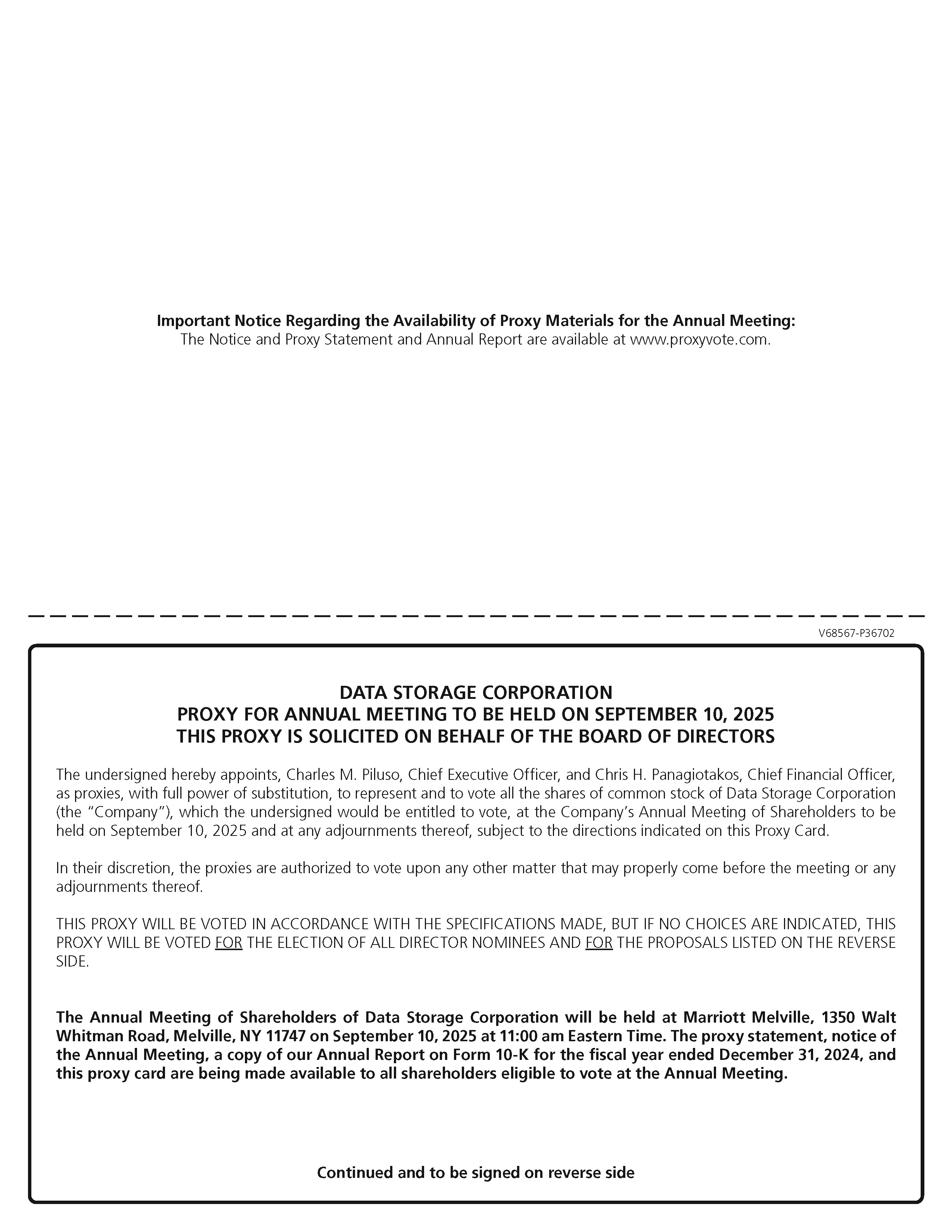Data Storage Corporation (“DSC”) invites you to attend its 2025 Annual Meeting (the “2025 Annual Meeting”) of Shareholders to be held at the Marriott Melville, 1350 Walt Whitman Road, Melville, NY 11747, on September 10, 2025, at 11:00 a.m. local time.