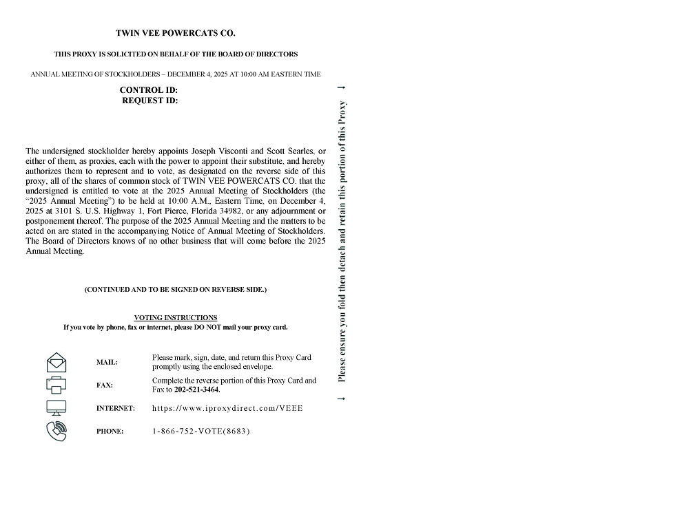 You are cordially invited to attend the 2025 Annual Meeting of Stockholders (the “2025 Annual Meeting”) of Twin Vee PowerCats Co., a Delaware corporation (“Twin Vee” or the “Company”). The meeting will be held on Thursday, December 4, 2025 at 10:00 a.m. Eastern Time at the offices of Twin Vee, 3101 S US Hwy 1, Fort Pierce, Florida 34982, for the following purposes: