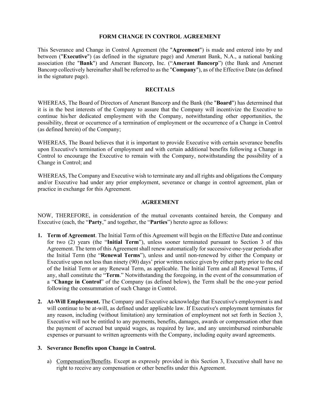 FORM CHANGE IN CONTROL AGREEMENT This Severance and Change in Control Agreement (the "Agreement") is made and entered into by and between ("Executive") (as defined in the signature page) and Amerant Bank, N.A., a national banking association (the "Bank") and Amerant Bancorp, Inc. (“Amerant Bancorp”) (the Bank and Amerant Bancorp collectively hereinafter shall be referred to as the "Company"), as of the Effective Date (as defined in the signature page). RECITALS WHEREAS, The Board of Directors of Amerant Bancorp and the Bank (the "Board") has determined that it is in the best interests of the Company to assure that the Company will incentivize the Executive to continue his/her dedicated employment with the Company, notwithstanding other opportunities, the possibility, threat or occurrence of a termination of employment or the occurrence of a Change in Control (as defined herein) of the Company; WHEREAS, The Board believes that it is important to provide Executive with certain severance benefits upon Executive's termination of employment and with certain additional benefits following a Change in Control to encourage the Executive to remain with the Company, notwithstanding the possibility of a Change in Control; and WHEREAS, The Company and Executive wish to terminate any and all rights and obligations the Company and/or Executive had under any prior employment, severance or change in control agreement, plan or practice in exchange for this Agreement. AGREEMENT NOW, THEREFORE, in consideration of the mutual covenants contained herein, the Company and Executive (each, the “Party,” and together, the “Parties”) hereto agree as follows: 1. Term of Agreement. The Initial Term of this Agreement will begin on the Effective Date and continue for two (2) years (the “Initial Term”), unless sooner terminated pursuant to Section 3 of this Agreement. The term of this Agreement shall renew automatically for successive one-year periods after the Initial Term (the “Renewal Terms”), unless and until non-renewed by either the Company or Executive upon not less than ninety (90) days’ prior written notice given by either party prior to the end of the Initial Term or any Renewal Term, as applicable. The Initial Term and all Renewal Terms, if any, shall constitute the “Term.” Notwithstanding the foregoing, in the event of the consummation of a “Change in Control” of the Company (as defined below), the Term shall be the one-year period following the consummation of such Change in Control. 2. At-Will Employment. The Company and Executive acknowledge that Executive's employment is and will continue to be at-will, as defined under applicable law. If Executive's employment terminates for any reason, including (without limitation) any termination of employment not set forth in Section 3, Executive will not be entitled to any payments, benefits, damages, awards or compensation other than the payment of accrued but unpaid wages, as required by law, and any unreimbursed reimbursable expenses or pursuant to written agreements with the Company, including equity award agreements. 3. Severance Benefits upon Change in Control. a) Compensation/Benefits. Except as expressly provided in this Section 3, Executive shall have no right to receive any compensation or other benefits under this Agreement.