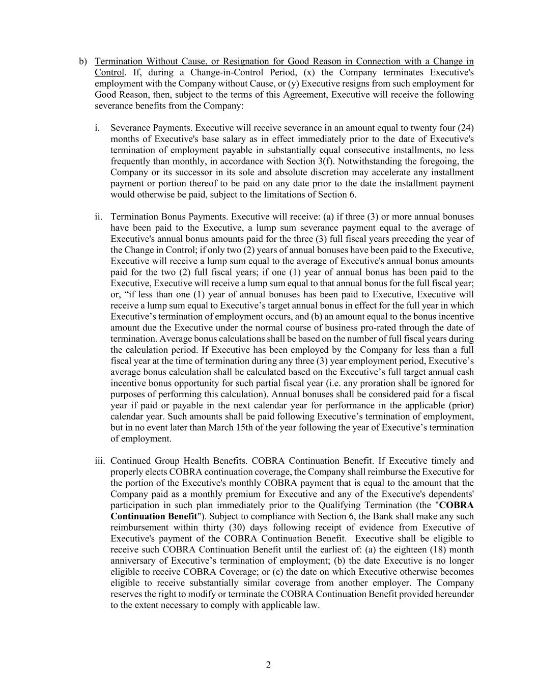2 b) Termination Without Cause, or Resignation for Good Reason in Connection with a Change in Control. If, during a Change-in-Control Period, (x) the Company terminates Executive's employment with the Company without Cause, or (y) Executive resigns from such employment for Good Reason, then, subject to the terms of this Agreement, Executive will receive the following severance benefits from the Company: i. Severance Payments. Executive will receive severance in an amount equal to twenty four (24) months of Executive's base salary as in effect immediately prior to the date of Executive's termination of employment payable in substantially equal consecutive installments, no less frequently than monthly, in accordance with Section 3(f). Notwithstanding the foregoing, the Company or its successor in its sole and absolute discretion may accelerate any installment payment or portion thereof to be paid on any date prior to the date the installment payment would otherwise be paid, subject to the limitations of Section 6. ii. Termination Bonus Payments. Executive will receive: (a) if three (3) or more annual bonuses have been paid to the Executive, a lump sum severance payment equal to the average of Executive's annual bonus amounts paid for the three (3) full fiscal years preceding the year of the Change in Control; if only two (2) years of annual bonuses have been paid to the Executive, Executive will receive a lump sum equal to the average of Executive's annual bonus amounts paid for the two (2) full fiscal years; if one (1) year of annual bonus has been paid to the Executive, Executive will receive a lump sum equal to that annual bonus for the full fiscal year; or, “if less than one (1) year of annual bonuses has been paid to Executive, Executive will receive a lump sum equal to Executive’s target annual bonus in effect for the full year in which Executive’s termination of employment occurs, and (b) an amount equal to the bonus incentive amount due the Executive under the normal course of business pro-rated through the date of termination. Average bonus calculations shall be based on the number of full fiscal years during the calculation period. If Executive has been employed by the Company for less than a full fiscal year at the time of termination during any three (3) year employment period, Executive’s average bonus calculation shall be calculated based on the Executive’s full target annual cash incentive bonus opportunity for such partial fiscal year (i.e. any proration shall be ignored for purposes of performing this calculation). Annual bonuses shall be considered paid for a fiscal year if paid or payable in the next calendar year for performance in the applicable (prior) calendar year. Such amounts shall be paid following Executive’s termination of employment, but in no event later than March 15th of the year following the year of Executive’s termination of employment. iii. Continued Group Health Benefits. COBRA Continuation Benefit. If Executive timely and properly elects COBRA continuation coverage, the Company shall reimburse the Executive for the portion of the Executive's monthly COBRA payment that is equal to the amount that the Company paid as a monthly premium for Executive and any of the Executive's dependents' participation in such plan immediately prior to the Qualifying Termination (the "COBRA Continuation Benefit"). Subject to compliance with Section 6, the Bank shall make any such reimbursement within thirty (30) days following receipt of evidence from Executive of Executive's payment of the COBRA Continuation Benefit. Executive shall be eligible to receive such COBRA Continuation Benefit until the earliest of: (a) the eighteen (18) month anniversary of Executive’s termination of employment; (b) the date Executive is no longer eligible to receive COBRA Coverage; or (c) the date on which Executive otherwise becomes eligible to receive substantially similar coverage from another employer. The Company reserves the right to modify or terminate the COBRA Continuation Benefit provided hereunder to the extent necessary to comply with applicable law.