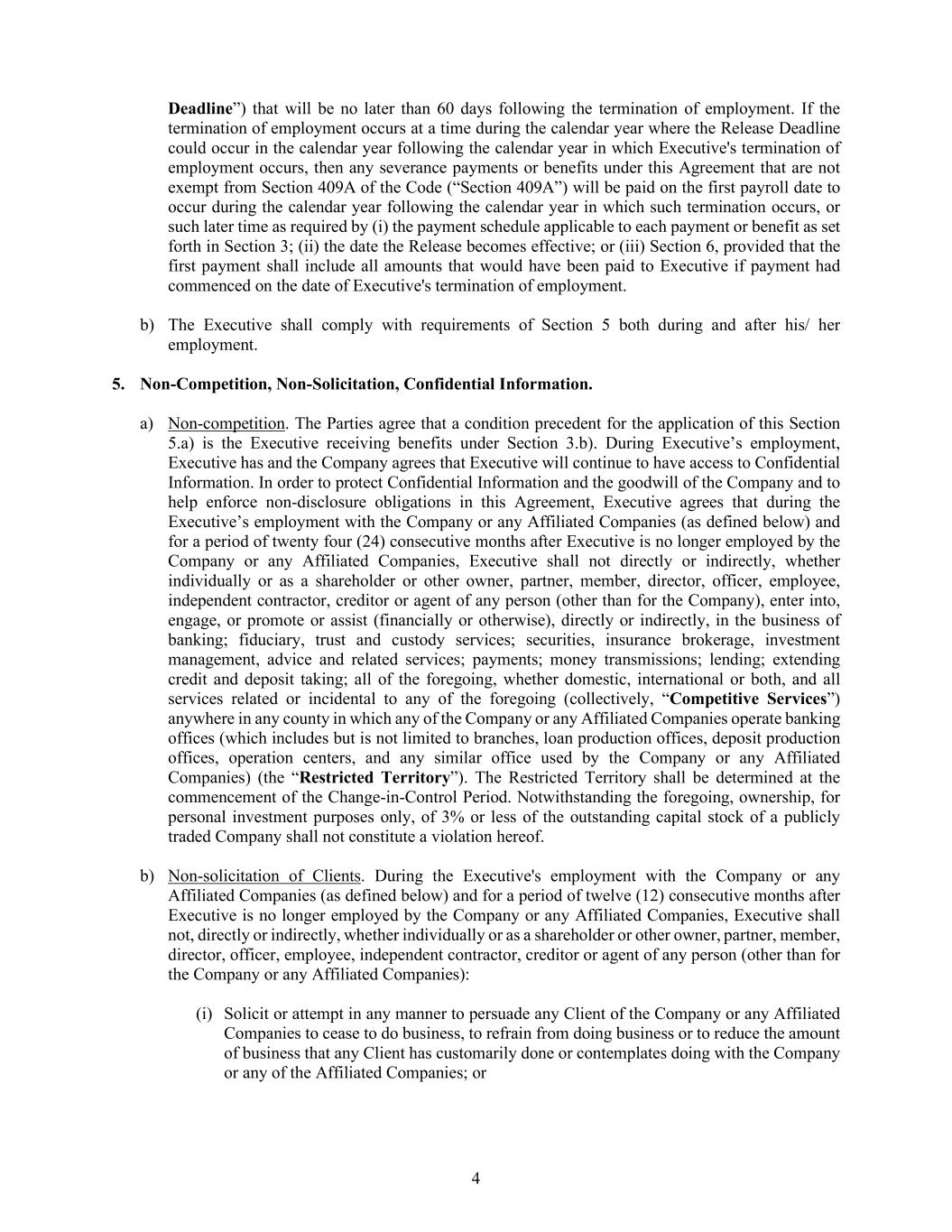 4 Deadline”) that will be no later than 60 days following the termination of employment. If the termination of employment occurs at a time during the calendar year where the Release Deadline could occur in the calendar year following the calendar year in which Executive's termination of employment occurs, then any severance payments or benefits under this Agreement that are not exempt from Section 409A of the Code (“Section 409A”) will be paid on the first payroll date to occur during the calendar year following the calendar year in which such termination occurs, or such later time as required by (i) the payment schedule applicable to each payment or benefit as set forth in Section 3; (ii) the date the Release becomes effective; or (iii) Section 6, provided that the first payment shall include all amounts that would have been paid to Executive if payment had commenced on the date of Executive's termination of employment. b) The Executive shall comply with requirements of Section 5 both during and after his/ her employment. 5. Non-Competition, Non-Solicitation, Confidential Information. a) Non-competition. The Parties agree that a condition precedent for the application of this Section 5.a) is the Executive receiving benefits under Section 3.b). During Executive’s employment, Executive has and the Company agrees that Executive will continue to have access to Confidential Information. In order to protect Confidential Information and the goodwill of the Company and to help enforce non-disclosure obligations in this Agreement, Executive agrees that during the Executive’s employment with the Company or any Affiliated Companies (as defined below) and for a period of twenty four (24) consecutive months after Executive is no longer employed by the Company or any Affiliated Companies, Executive shall not directly or indirectly, whether individually or as a shareholder or other owner, partner, member, director, officer, employee, independent contractor, creditor or agent of any person (other than for the Company), enter into, engage, or promote or assist (financially or otherwise), directly or indirectly, in the business of banking; fiduciary, trust and custody services; securities, insurance brokerage, investment management, advice and related services; payments; money transmissions; lending; extending credit and deposit taking; all of the foregoing, whether domestic, international or both, and all services related or incidental to any of the foregoing (collectively, “Competitive Services”) anywhere in any county in which any of the Company or any Affiliated Companies operate banking offices (which includes but is not limited to branches, loan production offices, deposit production offices, operation centers, and any similar office used by the Company or any Affiliated Companies) (the “Restricted Territory”). The Restricted Territory shall be determined at the commencement of the Change-in-Control Period. Notwithstanding the foregoing, ownership, for personal investment purposes only, of 3% or less of the outstanding capital stock of a publicly traded Company shall not constitute a violation hereof. b) Non-solicitation of Clients. During the Executive's employment with the Company or any Affiliated Companies (as defined below) and for a period of twelve (12) consecutive months after Executive is no longer employed by the Company or any Affiliated Companies, Executive shall not, directly or indirectly, whether individually or as a shareholder or other owner, partner, member, director, officer, employee, independent contractor, creditor or agent of any person (other than for the Company or any Affiliated Companies): (i) Solicit or attempt in any manner to persuade any Client of the Company or any Affiliated Companies to cease to do business, to refrain from doing business or to reduce the amount of business that any Client has customarily done or contemplates doing with the Company or any of the Affiliated Companies; or