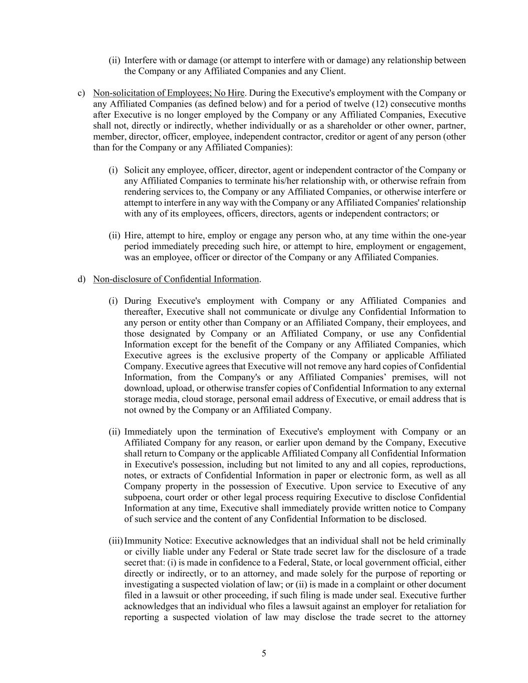 5 (ii) Interfere with or damage (or attempt to interfere with or damage) any relationship between the Company or any Affiliated Companies and any Client. c) Non-solicitation of Employees; No Hire. During the Executive's employment with the Company or any Affiliated Companies (as defined below) and for a period of twelve (12) consecutive months after Executive is no longer employed by the Company or any Affiliated Companies, Executive shall not, directly or indirectly, whether individually or as a shareholder or other owner, partner, member, director, officer, employee, independent contractor, creditor or agent of any person (other than for the Company or any Affiliated Companies): (i) Solicit any employee, officer, director, agent or independent contractor of the Company or any Affiliated Companies to terminate his/her relationship with, or otherwise refrain from rendering services to, the Company or any Affiliated Companies, or otherwise interfere or attempt to interfere in any way with the Company or any Affiliated Companies' relationship with any of its employees, officers, directors, agents or independent contractors; or (ii) Hire, attempt to hire, employ or engage any person who, at any time within the one-year period immediately preceding such hire, or attempt to hire, employment or engagement, was an employee, officer or director of the Company or any Affiliated Companies. d) Non-disclosure of Confidential Information. (i) During Executive's employment with Company or any Affiliated Companies and thereafter, Executive shall not communicate or divulge any Confidential Information to any person or entity other than Company or an Affiliated Company, their employees, and those designated by Company or an Affiliated Company, or use any Confidential Information except for the benefit of the Company or any Affiliated Companies, which Executive agrees is the exclusive property of the Company or applicable Affiliated Company. Executive agrees that Executive will not remove any hard copies of Confidential Information, from the Company's or any Affiliated Companies’ premises, will not download, upload, or otherwise transfer copies of Confidential Information to any external storage media, cloud storage, personal email address of Executive, or email address that is not owned by the Company or an Affiliated Company. (ii) Immediately upon the termination of Executive's employment with Company or an Affiliated Company for any reason, or earlier upon demand by the Company, Executive shall return to Company or the applicable Affiliated Company all Confidential Information in Executive's possession, including but not limited to any and all copies, reproductions, notes, or extracts of Confidential Information in paper or electronic form, as well as all Company property in the possession of Executive. Upon service to Executive of any subpoena, court order or other legal process requiring Executive to disclose Confidential Information at any time, Executive shall immediately provide written notice to Company of such service and the content of any Confidential Information to be disclosed. (iii) Immunity Notice: Executive acknowledges that an individual shall not be held criminally or civilly liable under any Federal or State trade secret law for the disclosure of a trade secret that: (i) is made in confidence to a Federal, State, or local government official, either directly or indirectly, or to an attorney, and made solely for the purpose of reporting or investigating a suspected violation of law; or (ii) is made in a complaint or other document filed in a lawsuit or other proceeding, if such filing is made under seal. Executive further acknowledges that an individual who files a lawsuit against an employer for retaliation for reporting a suspected violation of law may disclose the trade secret to the attorney
