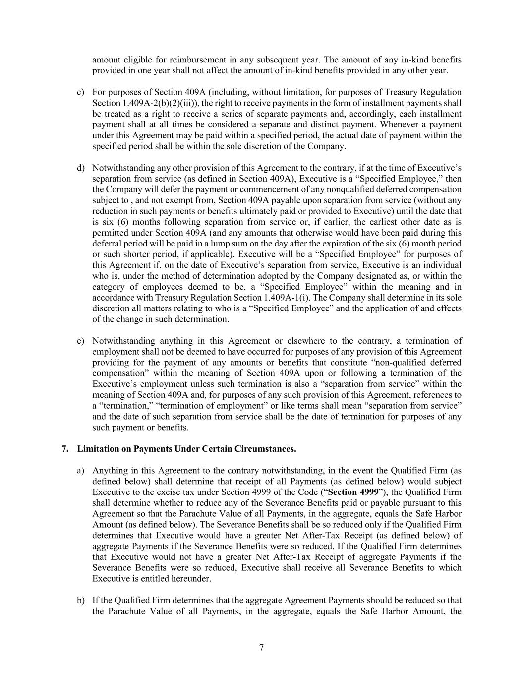 7 amount eligible for reimbursement in any subsequent year. The amount of any in-kind benefits provided in one year shall not affect the amount of in-kind benefits provided in any other year. c) For purposes of Section 409A (including, without limitation, for purposes of Treasury Regulation Section 1.409A-2(b)(2)(iii)), the right to receive payments in the form of installment payments shall be treated as a right to receive a series of separate payments and, accordingly, each installment payment shall at all times be considered a separate and distinct payment. Whenever a payment under this Agreement may be paid within a specified period, the actual date of payment within the specified period shall be within the sole discretion of the Company. d) Notwithstanding any other provision of this Agreement to the contrary, if at the time of Executive’s separation from service (as defined in Section 409A), Executive is a “Specified Employee,” then the Company will defer the payment or commencement of any nonqualified deferred compensation subject to , and not exempt from, Section 409A payable upon separation from service (without any reduction in such payments or benefits ultimately paid or provided to Executive) until the date that is six (6) months following separation from service or, if earlier, the earliest other date as is permitted under Section 409A (and any amounts that otherwise would have been paid during this deferral period will be paid in a lump sum on the day after the expiration of the six (6) month period or such shorter period, if applicable). Executive will be a “Specified Employee” for purposes of this Agreement if, on the date of Executive’s separation from service, Executive is an individual who is, under the method of determination adopted by the Company designated as, or within the category of employees deemed to be, a “Specified Employee” within the meaning and in accordance with Treasury Regulation Section 1.409A-1(i). The Company shall determine in its sole discretion all matters relating to who is a “Specified Employee” and the application of and effects of the change in such determination. e) Notwithstanding anything in this Agreement or elsewhere to the contrary, a termination of employment shall not be deemed to have occurred for purposes of any provision of this Agreement providing for the payment of any amounts or benefits that constitute “non-qualified deferred compensation” within the meaning of Section 409A upon or following a termination of the Executive’s employment unless such termination is also a “separation from service” within the meaning of Section 409A and, for purposes of any such provision of this Agreement, references to a “termination,” “termination of employment” or like terms shall mean “separation from service” and the date of such separation from service shall be the date of termination for purposes of any such payment or benefits. 7. Limitation on Payments Under Certain Circumstances. a) Anything in this Agreement to the contrary notwithstanding, in the event the Qualified Firm (as defined below) shall determine that receipt of all Payments (as defined below) would subject Executive to the excise tax under Section 4999 of the Code (“Section 4999”), the Qualified Firm shall determine whether to reduce any of the Severance Benefits paid or payable pursuant to this Agreement so that the Parachute Value of all Payments, in the aggregate, equals the Safe Harbor Amount (as defined below). The Severance Benefits shall be so reduced only if the Qualified Firm determines that Executive would have a greater Net After-Tax Receipt (as defined below) of aggregate Payments if the Severance Benefits were so reduced. If the Qualified Firm determines that Executive would not have a greater Net After-Tax Receipt of aggregate Payments if the Severance Benefits were so reduced, Executive shall receive all Severance Benefits to which Executive is entitled hereunder. b) If the Qualified Firm determines that the aggregate Agreement Payments should be reduced so that the Parachute Value of all Payments, in the aggregate, equals the Safe Harbor Amount, the