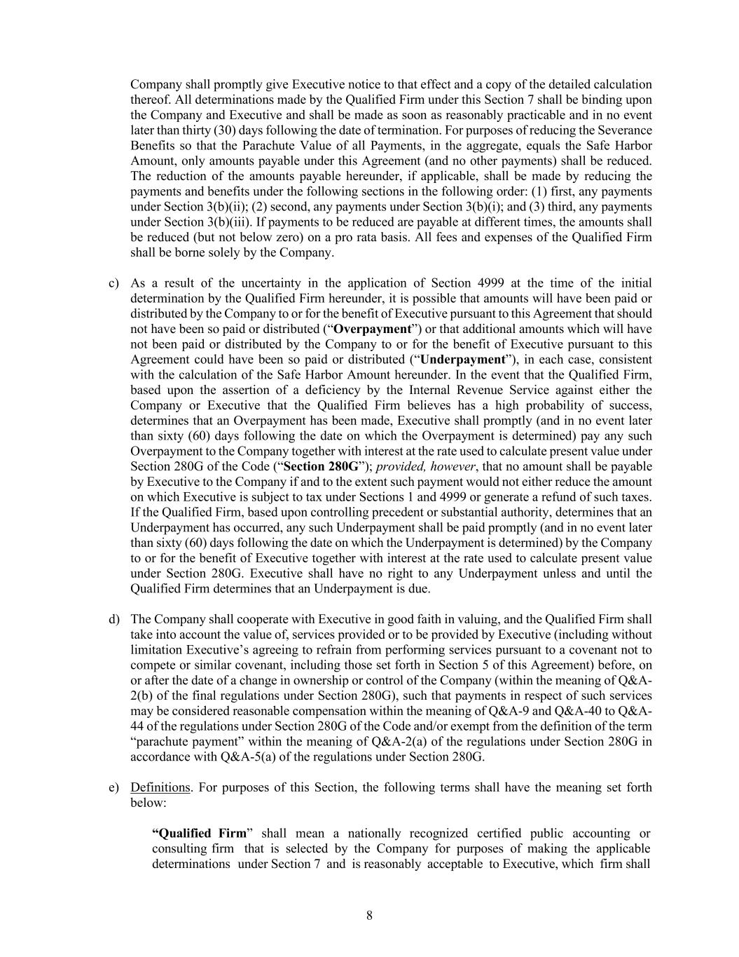 8 Company shall promptly give Executive notice to that effect and a copy of the detailed calculation thereof. All determinations made by the Qualified Firm under this Section 7 shall be binding upon the Company and Executive and shall be made as soon as reasonably practicable and in no event later than thirty (30) days following the date of termination. For purposes of reducing the Severance Benefits so that the Parachute Value of all Payments, in the aggregate, equals the Safe Harbor Amount, only amounts payable under this Agreement (and no other payments) shall be reduced. The reduction of the amounts payable hereunder, if applicable, shall be made by reducing the payments and benefits under the following sections in the following order: (1) first, any payments under Section 3(b)(ii); (2) second, any payments under Section 3(b)(i); and (3) third, any payments under Section 3(b)(iii). If payments to be reduced are payable at different times, the amounts shall be reduced (but not below zero) on a pro rata basis. All fees and expenses of the Qualified Firm shall be borne solely by the Company. c) As a result of the uncertainty in the application of Section 4999 at the time of the initial determination by the Qualified Firm hereunder, it is possible that amounts will have been paid or distributed by the Company to or for the benefit of Executive pursuant to this Agreement that should not have been so paid or distributed (“Overpayment”) or that additional amounts which will have not been paid or distributed by the Company to or for the benefit of Executive pursuant to this Agreement could have been so paid or distributed (“Underpayment”), in each case, consistent with the calculation of the Safe Harbor Amount hereunder. In the event that the Qualified Firm, based upon the assertion of a deficiency by the Internal Revenue Service against either the Company or Executive that the Qualified Firm believes has a high probability of success, determines that an Overpayment has been made, Executive shall promptly (and in no event later than sixty (60) days following the date on which the Overpayment is determined) pay any such Overpayment to the Company together with interest at the rate used to calculate present value under Section 280G of the Code (“Section 280G”); provided, however, that no amount shall be payable by Executive to the Company if and to the extent such payment would not either reduce the amount on which Executive is subject to tax under Sections 1 and 4999 or generate a refund of such taxes. If the Qualified Firm, based upon controlling precedent or substantial authority, determines that an Underpayment has occurred, any such Underpayment shall be paid promptly (and in no event later than sixty (60) days following the date on which the Underpayment is determined) by the Company to or for the benefit of Executive together with interest at the rate used to calculate present value under Section 280G. Executive shall have no right to any Underpayment unless and until the Qualified Firm determines that an Underpayment is due. d) The Company shall cooperate with Executive in good faith in valuing, and the Qualified Firm shall take into account the value of, services provided or to be provided by Executive (including without limitation Executive’s agreeing to refrain from performing services pursuant to a covenant not to compete or similar covenant, including those set forth in Section 5 of this Agreement) before, on or after the date of a change in ownership or control of the Company (within the meaning of Q&A- 2(b) of the final regulations under Section 280G), such that payments in respect of such services may be considered reasonable compensation within the meaning of Q&A-9 and Q&A-40 to Q&A- 44 of the regulations under Section 280G of the Code and/or exempt from the definition of the term “parachute payment” within the meaning of Q&A-2(a) of the regulations under Section 280G in accordance with Q&A-5(a) of the regulations under Section 280G. e) Definitions. For purposes of this Section, the following terms shall have the meaning set forth below: “Qualified Firm” shall mean a nationally recognized certified public accounting or consulting firm that is selected by the Company for purposes of making the applicable determinations under Section 7 and is reasonably acceptable to Executive, which firm shall