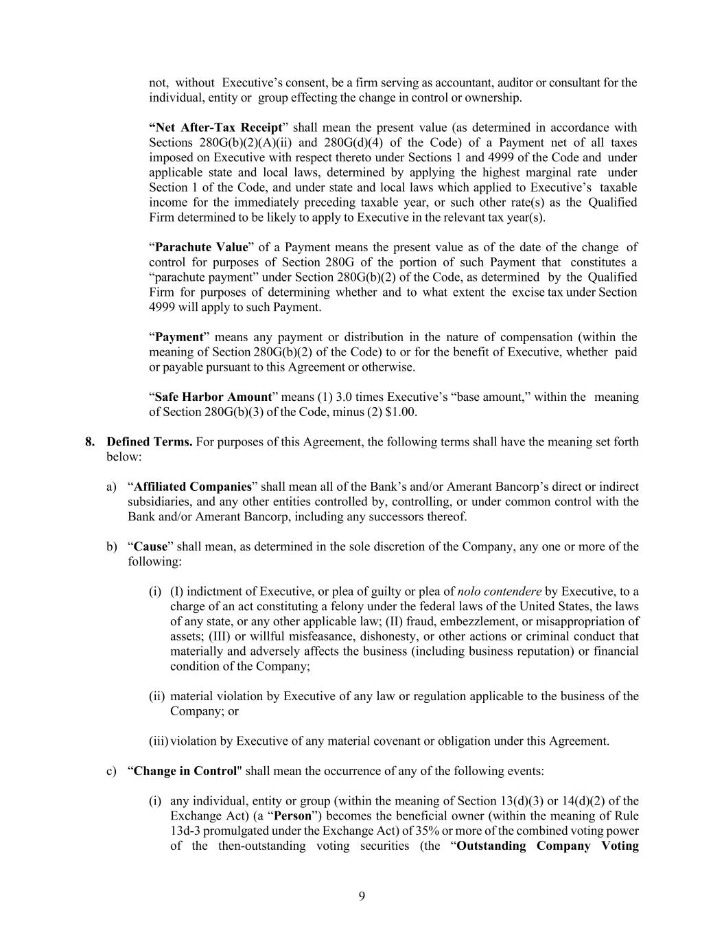 9 not, without Executive’s consent, be a firm serving as accountant, auditor or consultant for the individual, entity or group effecting the change in control or ownership. “Net After-Tax Receipt” shall mean the present value (as determined in accordance with Sections 280G(b)(2)(A)(ii) and 280G(d)(4) of the Code) of a Payment net of all taxes imposed on Executive with respect thereto under Sections 1 and 4999 of the Code and under applicable state and local laws, determined by applying the highest marginal rate under Section 1 of the Code, and under state and local laws which applied to Executive’s taxable income for the immediately preceding taxable year, or such other rate(s) as the Qualified Firm determined to be likely to apply to Executive in the relevant tax year(s). “Parachute Value” of a Payment means the present value as of the date of the change of control for purposes of Section 280G of the portion of such Payment that constitutes a “parachute payment” under Section 280G(b)(2) of the Code, as determined by the Qualified Firm for purposes of determining whether and to what extent the excise tax under Section 4999 will apply to such Payment. “Payment” means any payment or distribution in the nature of compensation (within the meaning of Section 280G(b)(2) of the Code) to or for the benefit of Executive, whether paid or payable pursuant to this Agreement or otherwise. “Safe Harbor Amount” means (1) 3.0 times Executive’s “base amount,” within the meaning of Section 280G(b)(3) of the Code, minus (2) $1.00. 8. Defined Terms. For purposes of this Agreement, the following terms shall have the meaning set forth below: a) “Affiliated Companies” shall mean all of the Bank’s and/or Amerant Bancorp’s direct or indirect subsidiaries, and any other entities controlled by, controlling, or under common control with the Bank and/or Amerant Bancorp, including any successors thereof. b) “Cause” shall mean, as determined in the sole discretion of the Company, any one or more of the following: (i) (I) indictment of Executive, or plea of guilty or plea of nolo contendere by Executive, to a charge of an act constituting a felony under the federal laws of the United States, the laws of any state, or any other applicable law; (II) fraud, embezzlement, or misappropriation of assets; (III) or willful misfeasance, dishonesty, or other actions or criminal conduct that materially and adversely affects the business (including business reputation) or financial condition of the Company; (ii) material violation by Executive of any law or regulation applicable to the business of the Company; or (iii) violation by Executive of any material covenant or obligation under this Agreement. c) “Change in Control" shall mean the occurrence of any of the following events: (i) any individual, entity or group (within the meaning of Section 13(d)(3) or 14(d)(2) of the Exchange Act) (a “Person”) becomes the beneficial owner (within the meaning of Rule 13d-3 promulgated under the Exchange Act) of 35% or more of the combined voting power of the then-outstanding voting securities (the “Outstanding Company Voting