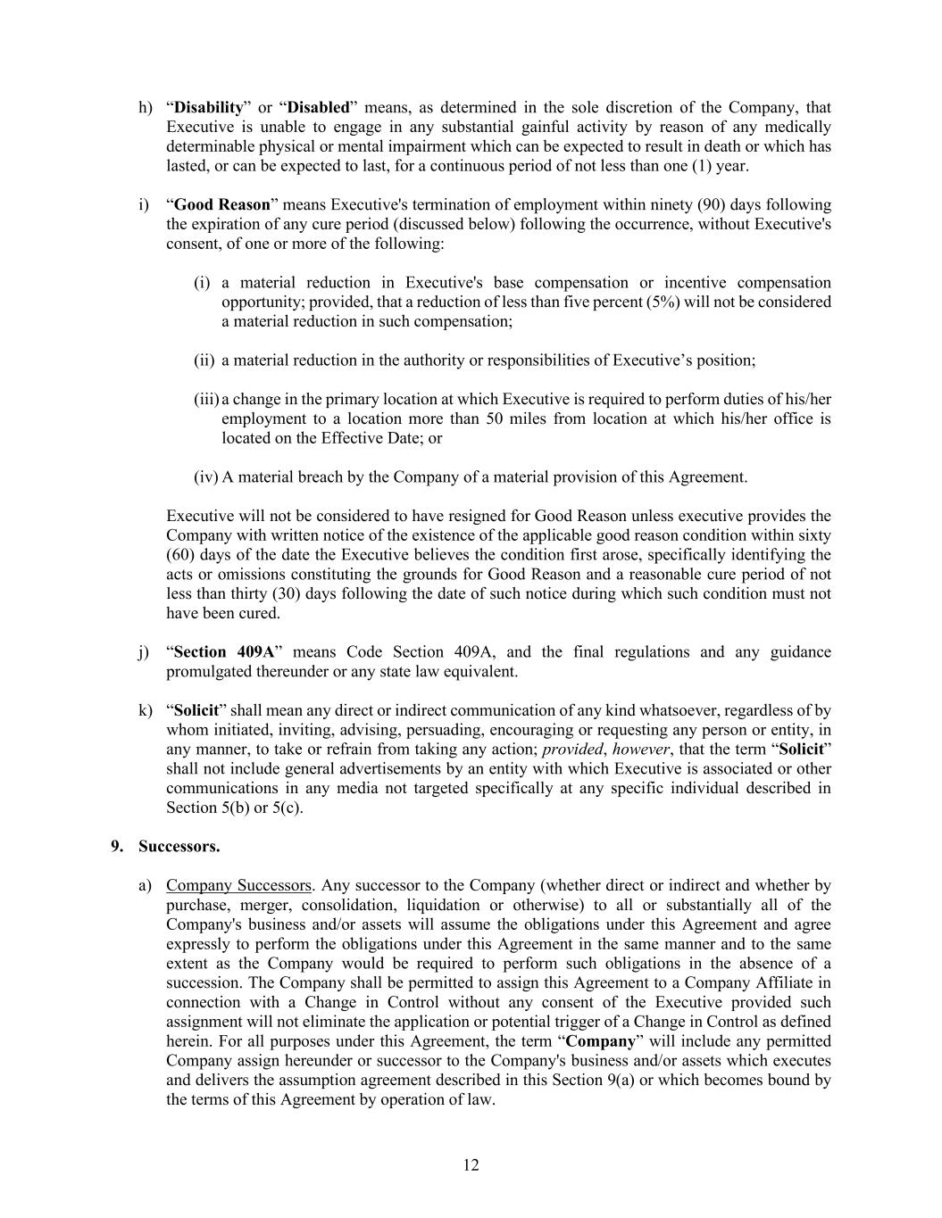 12 h) “Disability” or “Disabled” means, as determined in the sole discretion of the Company, that Executive is unable to engage in any substantial gainful activity by reason of any medically determinable physical or mental impairment which can be expected to result in death or which has lasted, or can be expected to last, for a continuous period of not less than one (1) year. i) “Good Reason” means Executive's termination of employment within ninety (90) days following the expiration of any cure period (discussed below) following the occurrence, without Executive's consent, of one or more of the following: (i) a material reduction in Executive's base compensation or incentive compensation opportunity; provided, that a reduction of less than five percent (5%) will not be considered a material reduction in such compensation; (ii) a material reduction in the authority or responsibilities of Executive’s position; (iii) a change in the primary location at which Executive is required to perform duties of his/her employment to a location more than 50 miles from location at which his/her office is located on the Effective Date; or (iv) A material breach by the Company of a material provision of this Agreement. Executive will not be considered to have resigned for Good Reason unless executive provides the Company with written notice of the existence of the applicable good reason condition within sixty (60) days of the date the Executive believes the condition first arose, specifically identifying the acts or omissions constituting the grounds for Good Reason and a reasonable cure period of not less than thirty (30) days following the date of such notice during which such condition must not have been cured. j) “Section 409A” means Code Section 409A, and the final regulations and any guidance promulgated thereunder or any state law equivalent. k) “Solicit” shall mean any direct or indirect communication of any kind whatsoever, regardless of by whom initiated, inviting, advising, persuading, encouraging or requesting any person or entity, in any manner, to take or refrain from taking any action; provided, however, that the term “Solicit” shall not include general advertisements by an entity with which Executive is associated or other communications in any media not targeted specifically at any specific individual described in Section 5(b) or 5(c). 9. Successors. a) Company Successors. Any successor to the Company (whether direct or indirect and whether by purchase, merger, consolidation, liquidation or otherwise) to all or substantially all of the Company's business and/or assets will assume the obligations under this Agreement and agree expressly to perform the obligations under this Agreement in the same manner and to the same extent as the Company would be required to perform such obligations in the absence of a succession. The Company shall be permitted to assign this Agreement to a Company Affiliate in connection with a Change in Control without any consent of the Executive provided such assignment will not eliminate the application or potential trigger of a Change in Control as defined herein. For all purposes under this Agreement, the term “Company” will include any permitted Company assign hereunder or successor to the Company's business and/or assets which executes and delivers the assumption agreement described in this Section 9(a) or which becomes bound by the terms of this Agreement by operation of law.
