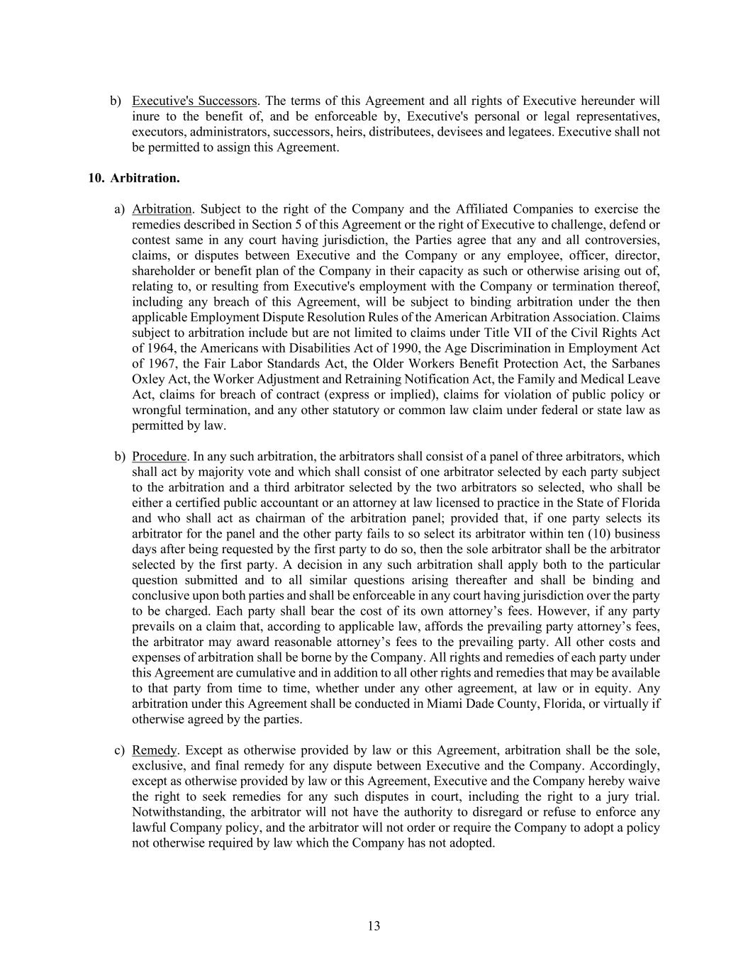 13 b) Executive's Successors. The terms of this Agreement and all rights of Executive hereunder will inure to the benefit of, and be enforceable by, Executive's personal or legal representatives, executors, administrators, successors, heirs, distributees, devisees and legatees. Executive shall not be permitted to assign this Agreement. 10. Arbitration. a) Arbitration. Subject to the right of the Company and the Affiliated Companies to exercise the remedies described in Section 5 of this Agreement or the right of Executive to challenge, defend or contest same in any court having jurisdiction, the Parties agree that any and all controversies, claims, or disputes between Executive and the Company or any employee, officer, director, shareholder or benefit plan of the Company in their capacity as such or otherwise arising out of, relating to, or resulting from Executive's employment with the Company or termination thereof, including any breach of this Agreement, will be subject to binding arbitration under the then applicable Employment Dispute Resolution Rules of the American Arbitration Association. Claims subject to arbitration include but are not limited to claims under Title VII of the Civil Rights Act of 1964, the Americans with Disabilities Act of 1990, the Age Discrimination in Employment Act of 1967, the Fair Labor Standards Act, the Older Workers Benefit Protection Act, the Sarbanes Oxley Act, the Worker Adjustment and Retraining Notification Act, the Family and Medical Leave Act, claims for breach of contract (express or implied), claims for violation of public policy or wrongful termination, and any other statutory or common law claim under federal or state law as permitted by law. b) Procedure. In any such arbitration, the arbitrators shall consist of a panel of three arbitrators, which shall act by majority vote and which shall consist of one arbitrator selected by each party subject to the arbitration and a third arbitrator selected by the two arbitrators so selected, who shall be either a certified public accountant or an attorney at law licensed to practice in the State of Florida and who shall act as chairman of the arbitration panel; provided that, if one party selects its arbitrator for the panel and the other party fails to so select its arbitrator within ten (10) business days after being requested by the first party to do so, then the sole arbitrator shall be the arbitrator selected by the first party. A decision in any such arbitration shall apply both to the particular question submitted and to all similar questions arising thereafter and shall be binding and conclusive upon both parties and shall be enforceable in any court having jurisdiction over the party to be charged. Each party shall bear the cost of its own attorney’s fees. However, if any party prevails on a claim that, according to applicable law, affords the prevailing party attorney’s fees, the arbitrator may award reasonable attorney’s fees to the prevailing party. All other costs and expenses of arbitration shall be borne by the Company. All rights and remedies of each party under this Agreement are cumulative and in addition to all other rights and remedies that may be available to that party from time to time, whether under any other agreement, at law or in equity. Any arbitration under this Agreement shall be conducted in Miami Dade County, Florida, or virtually if otherwise agreed by the parties. c) Remedy. Except as otherwise provided by law or this Agreement, arbitration shall be the sole, exclusive, and final remedy for any dispute between Executive and the Company. Accordingly, except as otherwise provided by law or this Agreement, Executive and the Company hereby waive the right to seek remedies for any such disputes in court, including the right to a jury trial. Notwithstanding, the arbitrator will not have the authority to disregard or refuse to enforce any lawful Company policy, and the arbitrator will not order or require the Company to adopt a policy not otherwise required by law which the Company has not adopted.