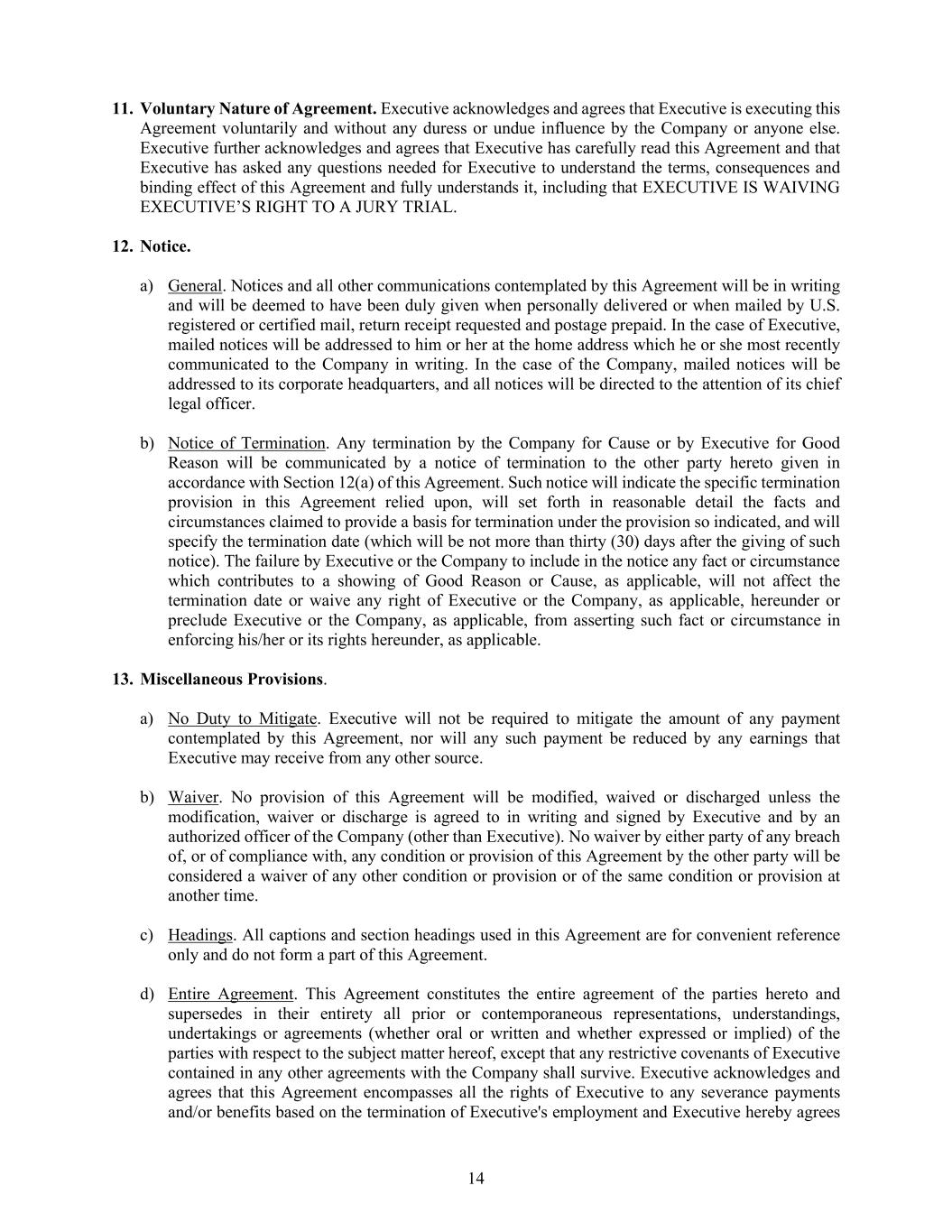 14 11. Voluntary Nature of Agreement. Executive acknowledges and agrees that Executive is executing this Agreement voluntarily and without any duress or undue influence by the Company or anyone else. Executive further acknowledges and agrees that Executive has carefully read this Agreement and that Executive has asked any questions needed for Executive to understand the terms, consequences and binding effect of this Agreement and fully understands it, including that EXECUTIVE IS WAIVING EXECUTIVE’S RIGHT TO A JURY TRIAL. 12. Notice. a) General. Notices and all other communications contemplated by this Agreement will be in writing and will be deemed to have been duly given when personally delivered or when mailed by U.S. registered or certified mail, return receipt requested and postage prepaid. In the case of Executive, mailed notices will be addressed to him or her at the home address which he or she most recently communicated to the Company in writing. In the case of the Company, mailed notices will be addressed to its corporate headquarters, and all notices will be directed to the attention of its chief legal officer. b) Notice of Termination. Any termination by the Company for Cause or by Executive for Good Reason will be communicated by a notice of termination to the other party hereto given in accordance with Section 12(a) of this Agreement. Such notice will indicate the specific termination provision in this Agreement relied upon, will set forth in reasonable detail the facts and circumstances claimed to provide a basis for termination under the provision so indicated, and will specify the termination date (which will be not more than thirty (30) days after the giving of such notice). The failure by Executive or the Company to include in the notice any fact or circumstance which contributes to a showing of Good Reason or Cause, as applicable, will not affect the termination date or waive any right of Executive or the Company, as applicable, hereunder or preclude Executive or the Company, as applicable, from asserting such fact or circumstance in enforcing his/her or its rights hereunder, as applicable. 13. Miscellaneous Provisions. a) No Duty to Mitigate. Executive will not be required to mitigate the amount of any payment contemplated by this Agreement, nor will any such payment be reduced by any earnings that Executive may receive from any other source. b) Waiver. No provision of this Agreement will be modified, waived or discharged unless the modification, waiver or discharge is agreed to in writing and signed by Executive and by an authorized officer of the Company (other than Executive). No waiver by either party of any breach of, or of compliance with, any condition or provision of this Agreement by the other party will be considered a waiver of any other condition or provision or of the same condition or provision at another time. c) Headings. All captions and section headings used in this Agreement are for convenient reference only and do not form a part of this Agreement. d) Entire Agreement. This Agreement constitutes the entire agreement of the parties hereto and supersedes in their entirety all prior or contemporaneous representations, understandings, undertakings or agreements (whether oral or written and whether expressed or implied) of the parties with respect to the subject matter hereof, except that any restrictive covenants of Executive contained in any other agreements with the Company shall survive. Executive acknowledges and agrees that this Agreement encompasses all the rights of Executive to any severance payments and/or benefits based on the termination of Executive's employment and Executive hereby agrees