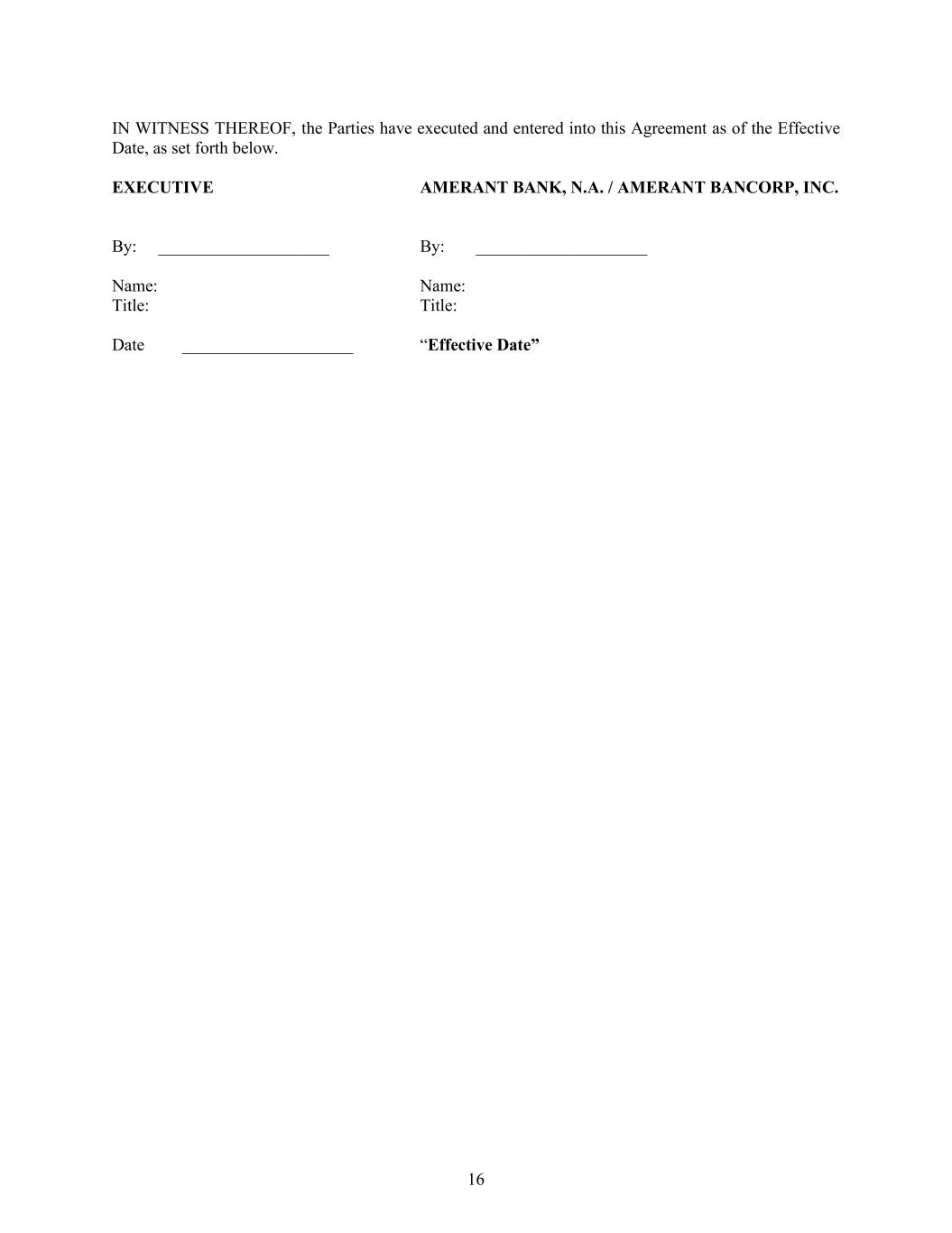 16 IN WITNESS THEREOF, the Parties have executed and entered into this Agreement as of the Effective Date, as set forth below. EXECUTIVE AMERANT BANK, N.A. / AMERANT BANCORP, INC. By: ____________________ By: ____________________ Name: Name: Title: Title: Date ____________________ “Effective Date”