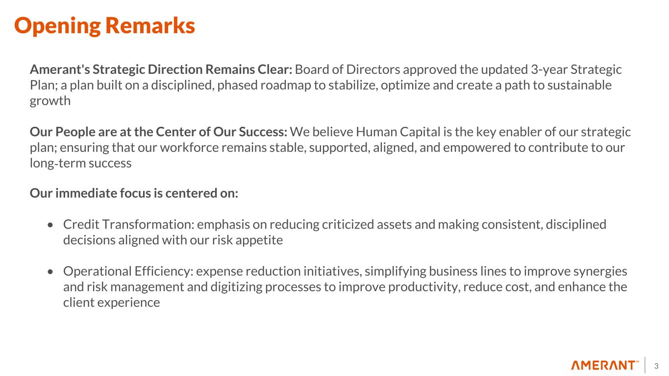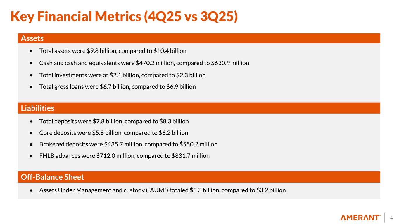 3 Amerant's Strategic Direction Remains Clear: Board of Directors approved the updated 3-year Strategic Plan; a plan built on a disciplined, phased roadmap to stabilize, optimize and create a path to sustainable growth Our People are at the Center of Our Success: We believe Human Capital is the key enabler of our strategic plan; ensuring that our workforce remains stable, supported, aligned, and empowered to contribute to our long-term success Our immediate focus is centered on: • Credit Transformation: emphasis on reducing criticized assets and making consistent, disciplined decisions aligned with our risk appetite • Operational Efficiency: expense reduction initiatives, simplifying business lines to improve synergies and risk management and digitizing processes to improve productivity, reduce cost, and enhance the client experience Opening Remarks