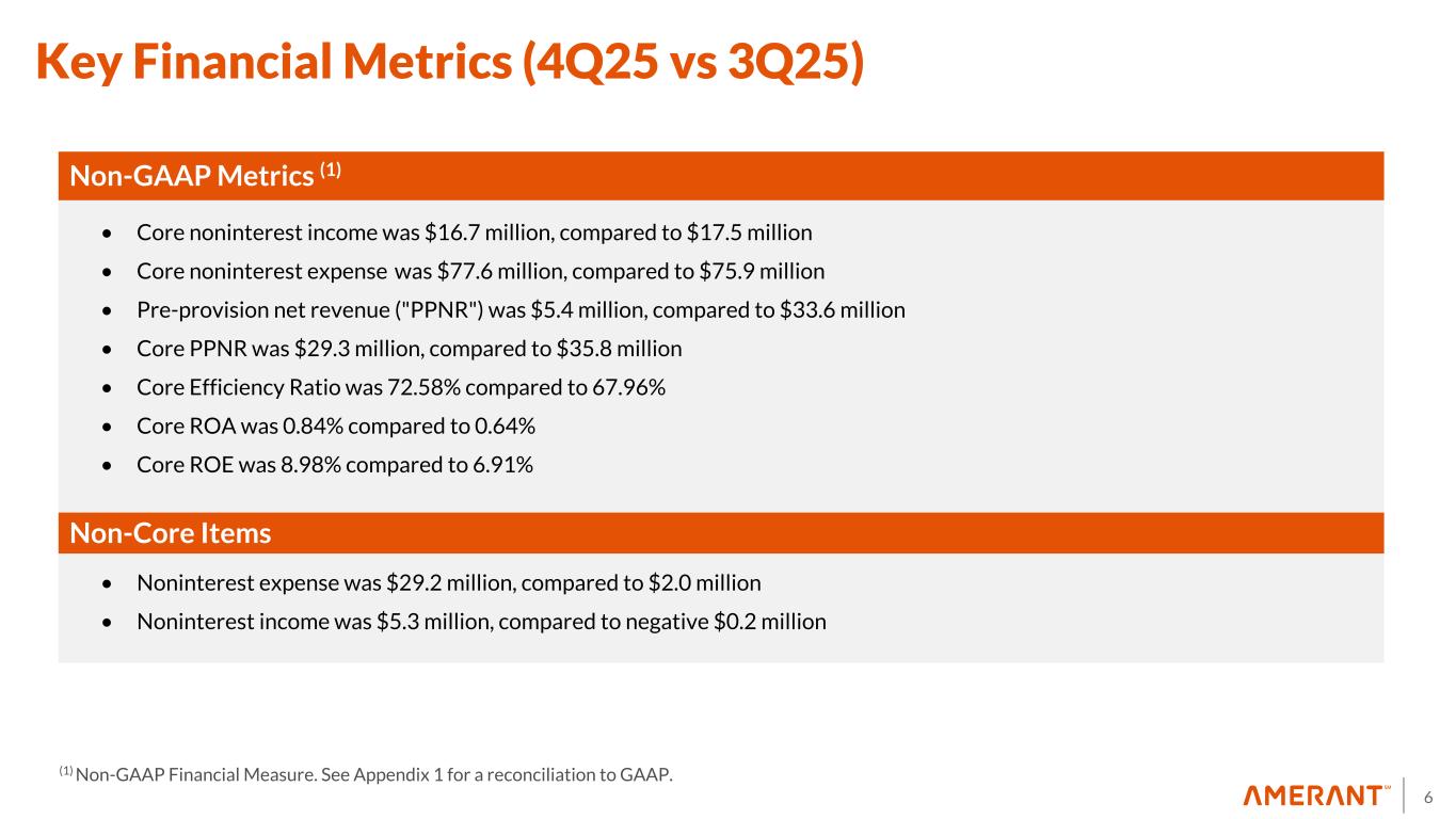5 Key Financial Metrics (4Q25 vs 3Q25) Income Statement • Net Interest Income (“NII”) was $90.2 million, compared to $94.2 million • Provision for credit losses was $3.5 million, compared to $14.6 million • Noninterest income was $22.0 million, compared to $17.3 million • Noninterest expense was $106.8 million, compared to $77.8 million • Net income attributable to the Company was $2.7 million, compared to net income of $14.8 million Relative Performance Metrics • Net Interest Margin ("NIM") was 3.78%, compared to 3.92% • Diluted earnings per share was $0.07, compared to diluted earnings per share of $0.35 • Efficiency ratio was 95.19%, compared to 69.84% • Return on Assets ("ROA") was 0.10%, compared to 0.57% • Return on Equity ("ROE") was 1.12%, compared to 6.21%