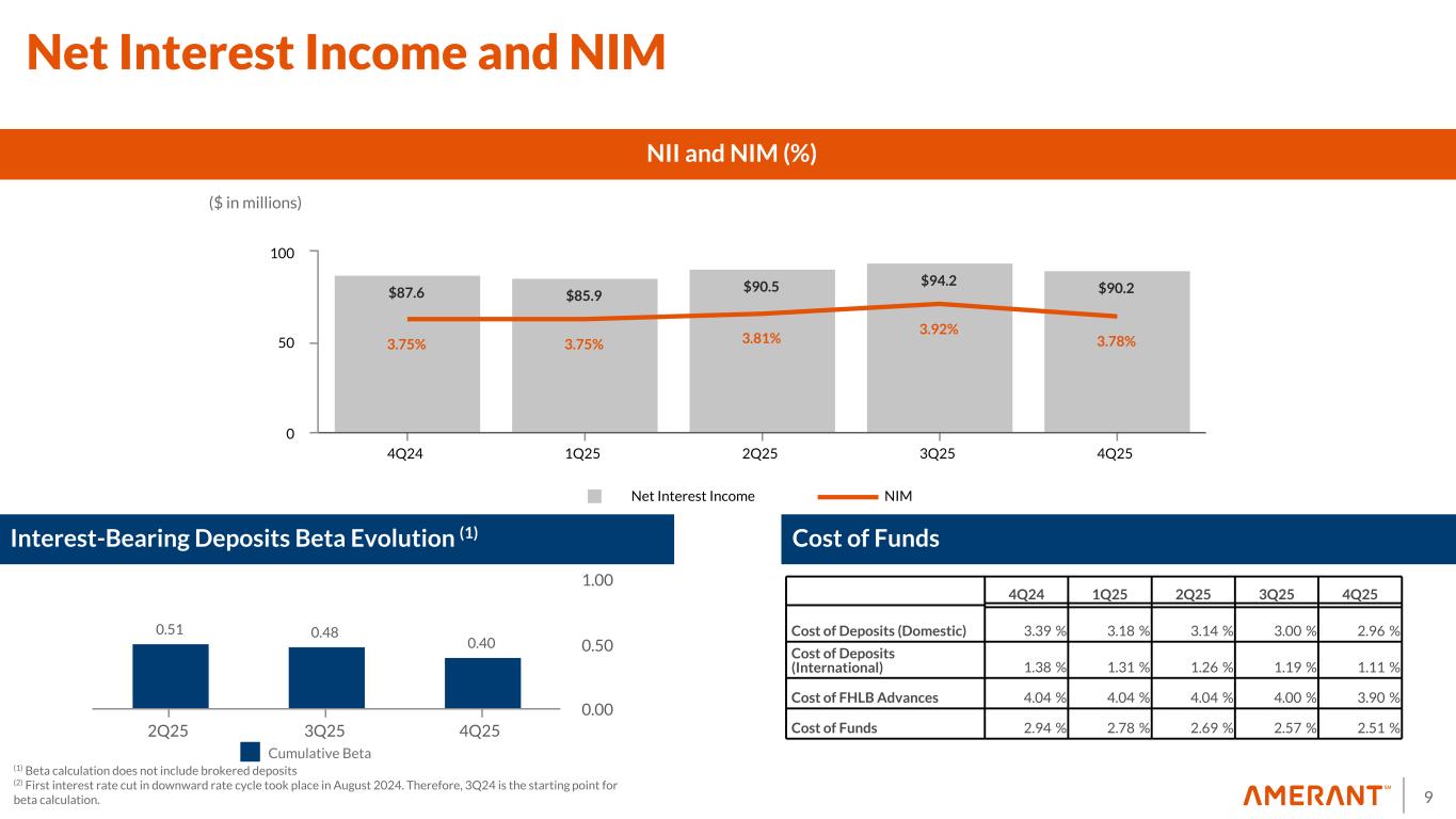 8 $7,855 $8,155 $8,307 $8,301 $7,787 $4,115 $4,280 $4,429 $4,434 $4,218 $1,533 $1,527 $1,528 $1,548 $1,560 $702 $695 $644 $550 $436 $1,505 $1,653 $1,706 $1,769 $1,573 2.76% 2.60% 2.53% 2.41% 2.34% 4Q24 1Q25 2Q25 3Q25 4Q25 Deposit Composition Loan Composition (2) Transaction Deposits Customer CDs Brokered Deposits (1) Cost of total Deposits ($ in millions) Noninterest Bearing Demand Deposits Well Diversified Deposit & Loan Mix (1) Brokered Deposits : There were $9 million and $60 million in brokered transaction deposits in 2Q25 and 1Q25, respectively, while there were none in 3Q25 and 4Q24. In 4Q25, 3Q25, 2Q25, 1Q25 and 4Q24, brokered time deposits were $435.6 million, $550 million, $635 million, $635 million, and $702 million, respectively. $7,271 $7,219 $7,189 $6,942 $6,697 $2,509 $2,549 $2,688 $2,563 $2,514 $1,922 $1,868 $1,723 $1,685 $1,595 $1,007 $992 $983 $901 $825 $1,560 $1,563 $1,546 $1,551 $1,518 $273 $248 $248 $243 $245 7.00% 6.84% 6.88% 6.93% 6.73% 4Q24 1Q25 2Q25 3Q25 4Q25 Consumer CRE Commercial and FI & Acceptances Owner Occupied Single Family Residential Average Loan Yield ($ in millions) (2) 4Q25 and 1Q25 includes both mortgage loans held for sale carried at fair value and loans held for sale carried at the lower of cost or fair value. There were no loans held for sale in 3Q25, while all other periods include mortgage loans held for sale at fair value.
