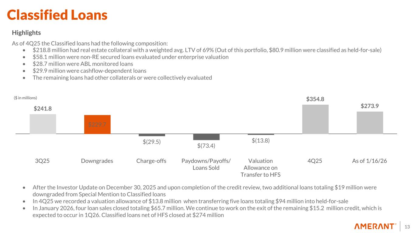 12 Non-Performing Loans • After the Investor Update on December 30, 2025 and upon completion of the credit review, three additional Classified loans totaling $17 million were placed in non-accrual status • In 4Q25 we recorded a valuation allowance of $3.6 million when transferring a $20 million loan into held-for-sale • In January 2026, the loan sale was completed reducing NPLs to $155.2 million ($ in millions) $124.3 $131.3 $(29.5) $(51.1) $(3.6) $171.4 $155.2 3Q25 Downgrades to NPLs Charge-offs Paydown/Payoffs/ Loans Sold and Others Valuation Allowance on Transfer to HFS 4Q25 As of 1/16/26 Highlights As of 4Q25 the NPLs had the following composition: • $78.3 million had real estate collateral with a weighted avg. LTV of 77% (Out of this portfolio, $16.2 million was classified as held-for-sale) • $39.5 million were non-RE secured loans evaluated under enterprise valuation • $27.1 million were cashflow-dependent loans • $9.5 million were ABL monitored loans • The remaining loans had other collaterals or were collectively evaluated