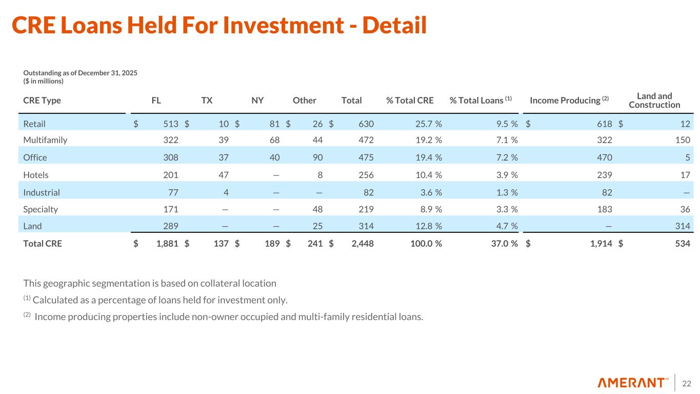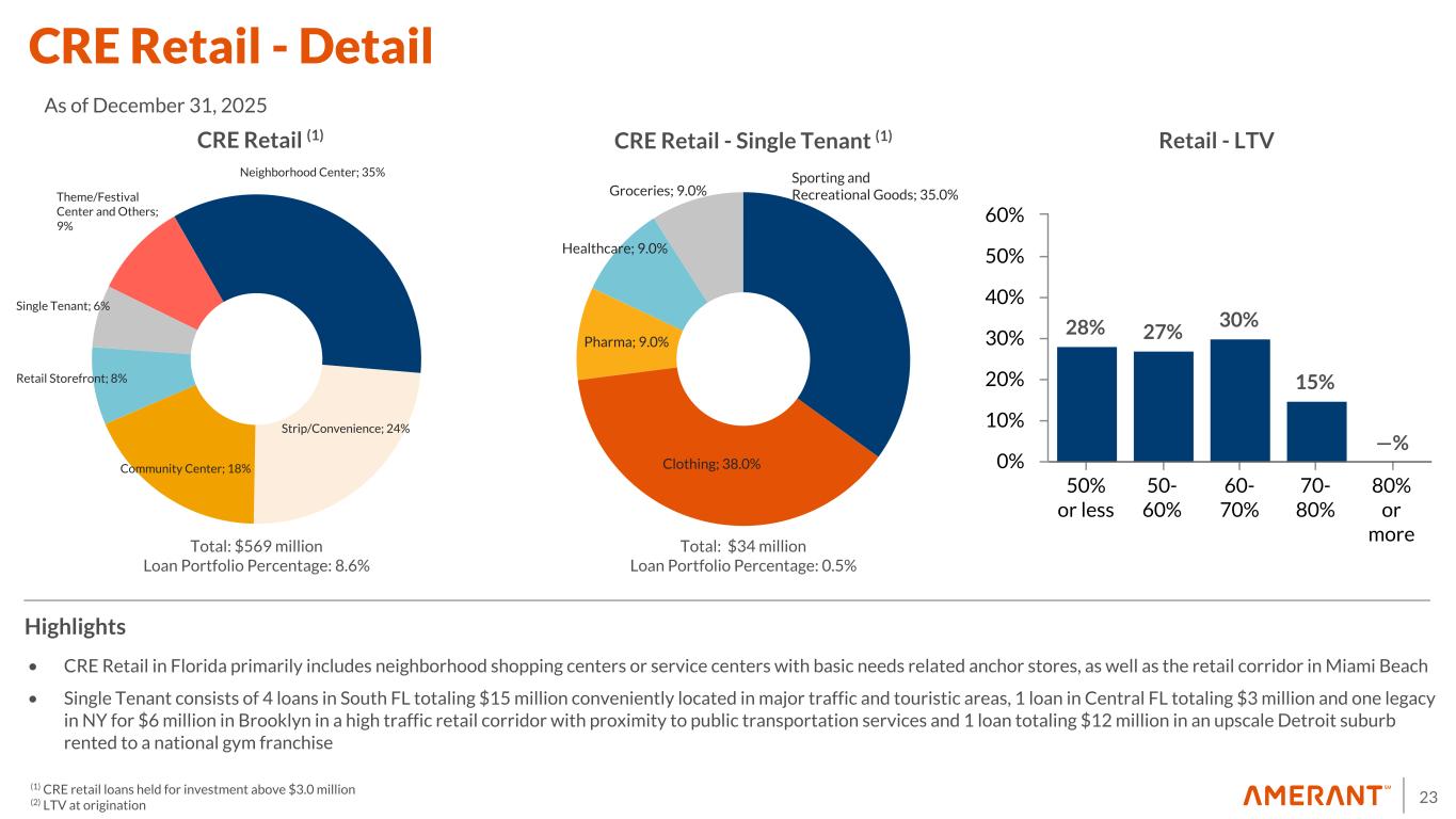 22 CRE Type FL TX NY Other Total % Total CRE % Total Loans (1) Income Producing (2) Land and Construction Retail $ 513 $ 10 $ 81 $ 26 $ 630 25.7 % 9.5 % $ 618 $ 12 Multifamily 322 39 68 44 472 19.2 % 7.1 % 322 150 Office 308 37 40 90 475 19.4 % 7.2 % 470 5 Hotels 201 47 — 8 256 10.4 % 3.9 % 239 17 Industrial 77 4 — — 82 3.6 % 1.3 % 82 — Specialty 171 — — 48 219 8.9 % 3.3 % 183 36 Land 289 — — 25 314 12.8 % 4.7 % — 314 Total CRE $ 1,881 $ 137 $ 189 $ 241 $ 2,448 100.0 % 37.0 % $ 1,914 $ 534 Outstanding as of December 31, 2025 ($ in millions) CRE Loans Held For Investment - Detail This geographic segmentation is based on collateral location (1) Calculated as a percentage of loans held for investment only. (2) Income producing properties include non-owner occupied and multi-family residential loans.