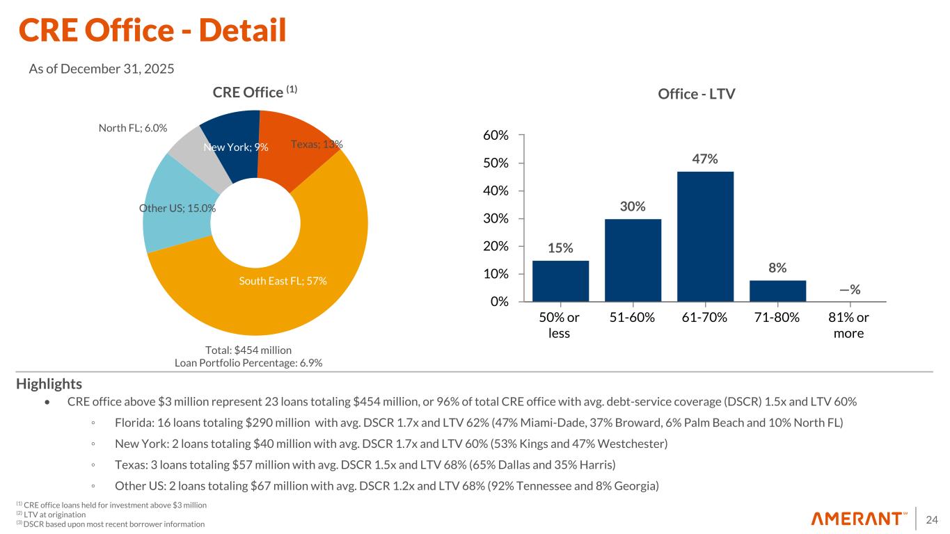 24 New York; 9% Texas; 13% South East FL; 57% Other US; 15.0% North FL; 6.0% 15% 30% 47% 8% —% 50% or less 51-60% 61-70% 71-80% 81% or more 0% 10% 20% 30% 40% 50% 60% • CRE office above $3 million represent 23 loans totaling $454 million, or 96% of total CRE office with avg. debt-service coverage (DSCR) 1.5x and LTV 60% ◦ Florida: 16 loans totaling $290 million with avg. DSCR 1.7x and LTV 62% (47% Miami-Dade, 37% Broward, 6% Palm Beach and 10% North FL) ◦ New York: 2 loans totaling $40 million with avg. DSCR 1.7x and LTV 60% (53% Kings and 47% Westchester) ◦ Texas: 3 loans totaling $57 million with avg. DSCR 1.5x and LTV 68% (65% Dallas and 35% Harris) ◦ Other US: 2 loans totaling $67 million with avg. DSCR 1.2x and LTV 68% (92% Tennessee and 8% Georgia) Highlights CRE Office (1) Office - LTV Total: $454 million Loan Portfolio Percentage: 6.9% CRE Office - Detail As of December 31, 2025 (1) CRE office loans held for investment above $3 million (2) LTV at origination (3) DSCR based upon most recent borrower information