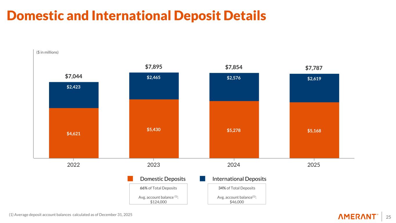 25 $7,044 $7,895 $7,854 $7,787 $4,621 $5,430 $5,278 $5,168 $2,423 $2,465 $2,576 $2,619 Domestic Deposits International Deposits 2022 2023 2024 2025 ($ in millions) 34% of Total Deposits Avg. account balance(1): $46,000 66% of Total Deposits Avg. account balance (1): $124,000 Domestic and International Deposit Details (1) Average deposit account balances calculated as of December 31, 2025