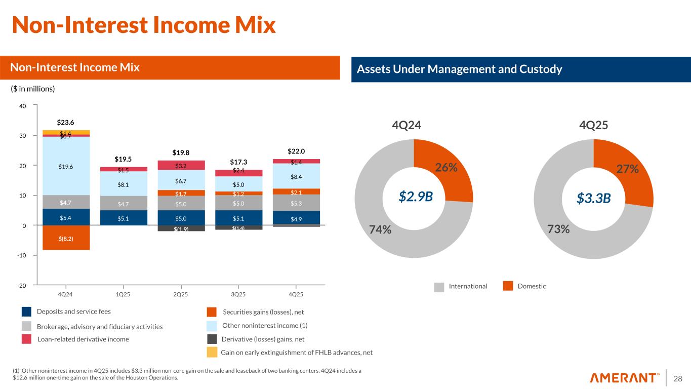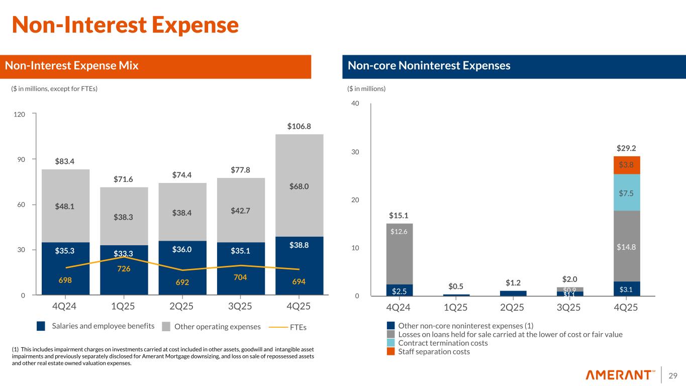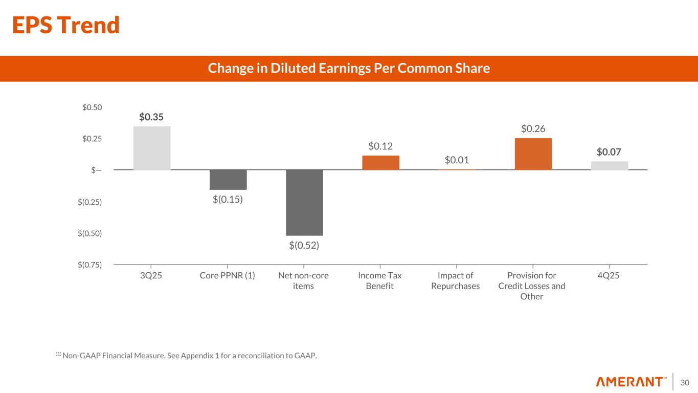 29 $83.4 $71.6 $74.4 $77.8 $106.8 $35.3 $33.3 $36.0 $35.1 $38.8 $48.1 $38.3 $38.4 $42.7 $68.0 698 726 692 704 694 4Q24 1Q25 2Q25 3Q25 4Q25 0 30 60 90 120 Non-Interest Expense Mix ($ in millions, except for FTEs) Non-core Noninterest Expenses $15.1 $0.5 $1.2 $2.0 $29.2 $2.5 $1.1 $3.1 $12.6 $0.9 $14.8 $7.5 $3.8 Other non-core noninterest expenses (1) Losses on loans held for sale carried at the lower of cost or fair value Contract termination costs Staff separation costs 4Q24 1Q25 2Q25 3Q25 4Q25 0 10 20 30 40 ($ in millions) Non-Interest Expense Salaries and employee benefits Other operating expenses FTEs (1) This includes impairment charges on investments carried at cost included in other assets, goodwill and intangible asset impairments and previously separately disclosed for Amerant Mortgage downsizing, and loss on sale of repossessed assets and other real estate owned valuation expenses.
