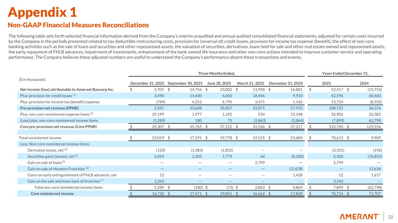 32 Appendix 1 Non-GAAP Financial Measures Reconciliations The following table sets forth selected financial information derived from the Company’s interim unaudited and annual audited consolidated financial statements, adjusted for certain costs incurred by the Company in the periods presented related to tax deductible restructuring costs, provision for (reversal of) credit losses, provision for income tax expense (benefit), the effect of non-core banking activities such as the sale of loans and securities and other repossessed assets, the valuation of securities, derivatives, loans held for sale and other real estate owned and repossessed assets, the early repayment of FHLB advances, impairment of investments, enhancement of the bank owned life insurance and other non-core actions intended to improve customer service and operating performance. The Company believes these adjusted numbers are useful to understand the Company’s performance absent these transactions and events. Three Months Ended, Years Ended December 31, ($ in thousands) December 31, 2025 September 30, 2025 June 30, 2025 March 31, 2025 December 31, 2024 2025 2024 Net income (loss) attributable to Amerant Bancorp Inc. $ 2,701 $ 14,756 $ 23,002 $ 11,958 $ 16,881 $ 52,417 $ (15,752) Plus: provision for credit losses (1) 3,490 14,600 6,060 18,446 9,910 42,596 60,460 Plus: provision for income tax (benefit) expense (794) 4,252 6,795 3,471 1,142 13,724 (8,332) Pre-provision net revenue (PPNR) 5,397 33,608 35,857 33,875 27,933 108,737 36,376 Plus: non-core noninterest expense items (2) 29,199 1,977 1,192 534 15,148 32,902 26,382 (Less) plus: non-core noninterest income items (5,289) 180 73 (2,863) (5,864) (7,899) 62,798 Core pre-provision net revenue (Core PPNR) $ 29,307 $ 35,765 $ 37,122 $ 31,546 $ 37,217 $ 133,740 $ 125,556 Total noninterest income $ 22,019 $ 17,291 $ 19,778 $ 19,525 $ 23,684 $ 78,613 $ 9,909 Less: Non-core noninterest income items: Derivative losses, net (3) (120) (1,383) (1,852) — — (3,355) (196) Securities gains (losses), net (4) 2,054 1,203 1,779 64 (8,200) 5,100 (76,855) Gain on sale of loans (5) — — — 2,799 — 2,799 — Gain on sale of Houston Franchise (6) — — — — 12,636 — 12,636 Gains on early extinguishment of FHLB advances, net 12 — — — 1,428 12 1,617 Gain on the sale and lease back of branches (7) 3,343 — — — — 3,343 — Total non-core noninterest income items $ 5,289 $ (180) $ (73) $ 2,863 $ 5,864 $ 7,899 $ (62,798) Core noninterest income $ 16,730 $ 17,471 $ 19,851 $ 16,662 $ 17,820 $ 70,714 $ 72,707