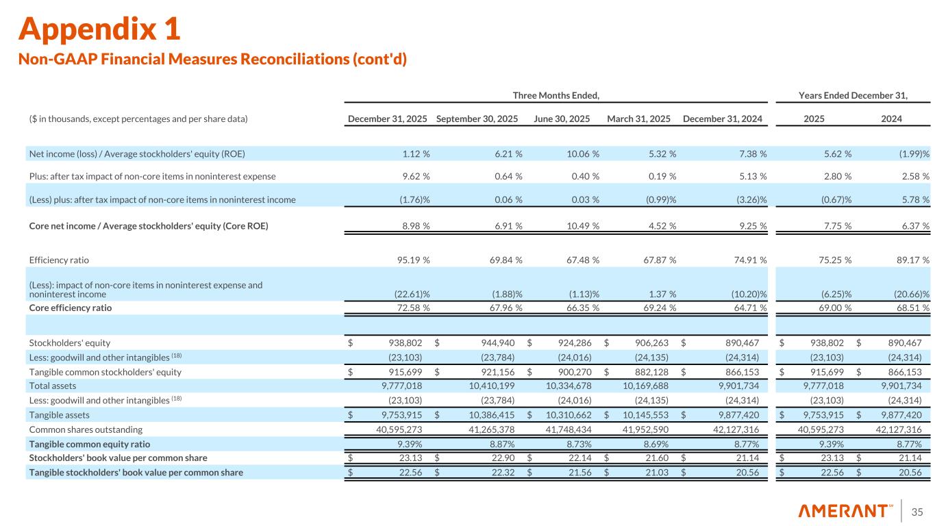 34 Three Months Ended, Years Ended December 31, ($ in thousands, except percentages and per share data) December 31, 2025 September 30, 2025 June 30, 2025 March 31, 2025 December 31, 2024 2025 2024 Net income (loss) attributable to Amerant Bancorp Inc. $ 2,701 $ 14,756 $ 23,002 $ 11,958 $ 16,881 $ 52,417 $ (15,752) Plus after-tax non-core items in noninterest expense: Non-core items in noninterest expense before income tax effect 29,199 1,977 1,192 534 15,148 32,902 26,382 Income tax effect (16) (5,990) (445) (272) (120) (3,409) (6,827) (5,937) Total after-tax non-core items in noninterest expense 23,209 1,532 920 414 11,739 26,075 20,445 (Less) plus: before-tax non-core items in noninterest income: Non-core items in noninterest income before income tax effect (5,289) 180 73 (2,863) (5,864) (7,899) 62,798 Income tax effect (16) 1,049 (43) (11) 644 (1,596) 1,639 (17,045) Total after-tax non-core items in noninterest income (4,240) 137 62 (2,219) (7,460) (6,260) 45,753 Core net income $ 21,670 $ 16,425 $ 23,984 $ 10,153 $ 21,160 $ 72,232 $ 50,446 Basic earnings (loss) per share $ 0.07 $ 0.35 $ 0.55 $ 0.28 $ 0.40 $ 1.26 $ (0.44) Plus: after tax impact of non-core items in noninterest expense 0.57 0.04 0.02 0.01 0.28 0.63 0.57 (Less) plus: after tax impact of non-core items in noninterest income (0.11) — — (0.05) (0.18) (0.15) 1.28 Total core basic earnings per common share $ 0.53 $ 0.39 $ 0.57 $ 0.24 $ 0.50 $ 1.74 $ 1.41 Diluted earnings (loss) per share (17) $ 0.07 $ 0.35 $ 0.55 $ 0.28 $ 0.40 $ 1.26 $ (0.44) Plus: after tax impact of non-core items in noninterest expense 0.56 0.04 0.02 0.01 0.28 0.62 0.57 (Less) plus: after tax impact of non-core items in noninterest income (0.10) — — (0.05) (0.18) (0.15) 1.28 Total core diluted earnings per common share $ 0.53 $ 0.39 $ 0.57 $ 0.24 $ 0.50 $ 1.73 $ 1.41 Net income (loss) / Average total assets (ROA) 0.10 % 0.57 % 0.90 % 0.48 % 0.67 % 0.51 % (0.16) % Plus: after tax impact of non-core items in noninterest expense 0.90 % 0.06 % 0.04 % 0.02 % 0.46 % 0.26 % 0.21 % (Less) plus: after tax impact of non-core items in noninterest income (0.16) % 0.01 % — % (0.09) % (0.30) % (0.06) % 0.46 % Core net income / Average total assets (Core ROA) 0.84 % 0.64 % 0.94 % 0.41 % 0.83 % 0.71 % 0.51 % Appendix 1 Non-GAAP Financial Measures Reconciliations (cont'd)
