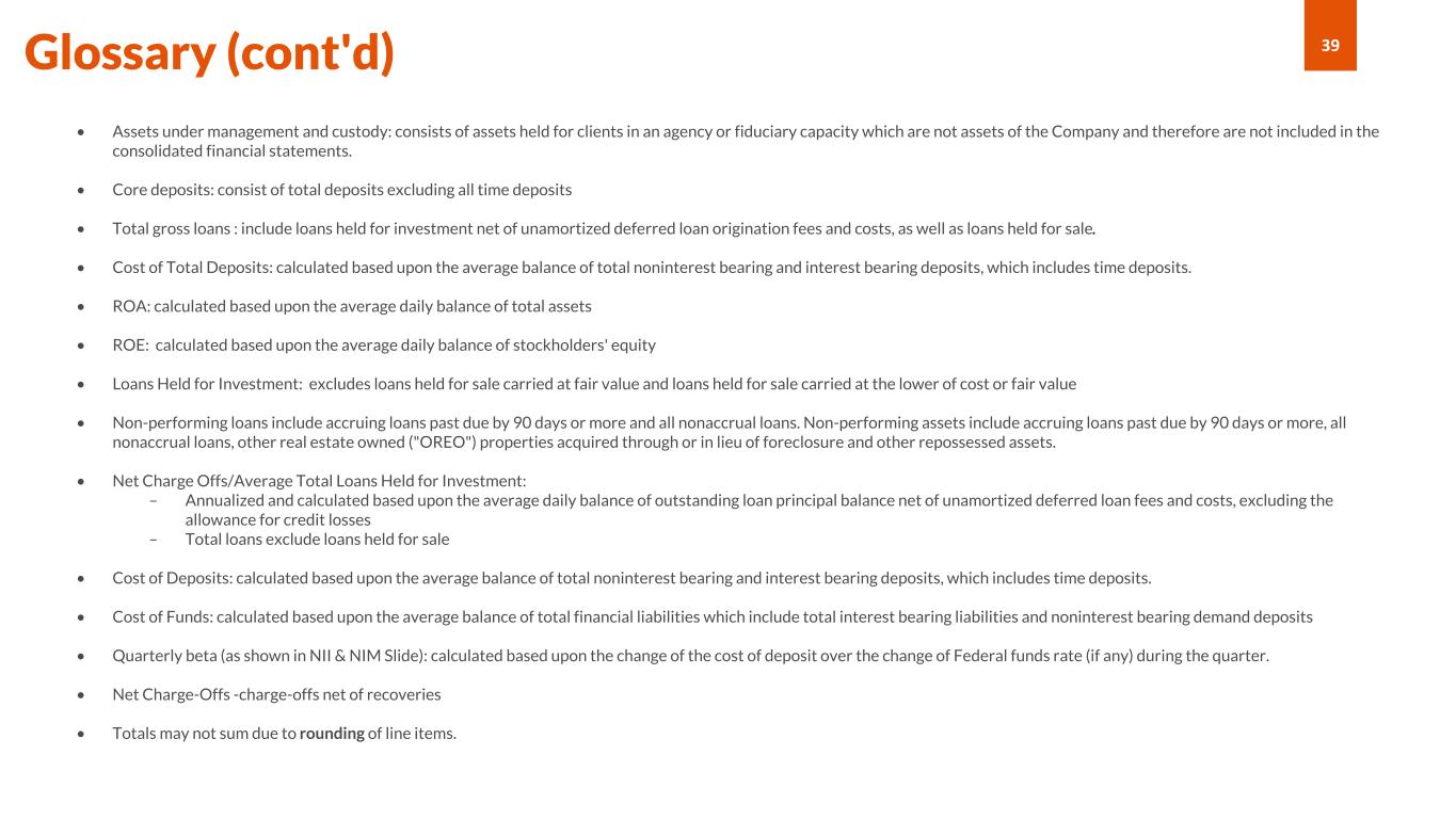 39Glossary (cont'd) • Assets under management and custody: consists of assets held for clients in an agency or fiduciary capacity which are not assets of the Company and therefore are not included in the consolidated financial statements. • Core deposits: consist of total deposits excluding all time deposits • Total gross loans : include loans held for investment net of unamortized deferred loan origination fees and costs, as well as loans held for sale. • Cost of Total Deposits: calculated based upon the average balance of total noninterest bearing and interest bearing deposits, which includes time deposits. • ROA: calculated based upon the average daily balance of total assets • ROE: calculated based upon the average daily balance of stockholders' equity • Loans Held for Investment: excludes loans held for sale carried at fair value and loans held for sale carried at the lower of cost or fair value • Non-performing loans include accruing loans past due by 90 days or more and all nonaccrual loans. Non-performing assets include accruing loans past due by 90 days or more, all nonaccrual loans, other real estate owned ("OREO") properties acquired through or in lieu of foreclosure and other repossessed assets. • Net Charge Offs/Average Total Loans Held for Investment: – Annualized and calculated based upon the average daily balance of outstanding loan principal balance net of unamortized deferred loan fees and costs, excluding the allowance for credit losses – Total loans exclude loans held for sale • Cost of Deposits: calculated based upon the average balance of total noninterest bearing and interest bearing deposits, which includes time deposits. • Cost of Funds: calculated based upon the average balance of total financial liabilities which include total interest bearing liabilities and noninterest bearing demand deposits • Quarterly beta (as shown in NII & NIM Slide): calculated based upon the change of the cost of deposit over the change of Federal funds rate (if any) during the quarter. • Net Charge-Offs -charge-offs net of recoveries • Totals may not sum due to rounding of line items.