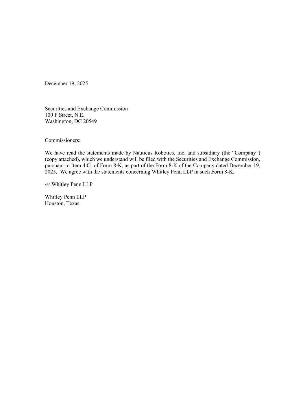 December 19, 2025 Securities and Exchange Commission 100 F Street, N.E. Washington, DC 20549 Commissioners: We have read the statements made by Nauticus Robotics, Inc. and subsidiary (the “Company”) (copy attached), which we understand will be filed with the Securities and Exchange Commission, pursuant to Item 4.01 of Form 8-K, as part of the Form 8-K of the Company dated December 19, 2025. We agree with the statements concerning Whitley Penn LLP in such Form 8-K. /s/ Whitley Penn LLP Whitley Penn LLP Houston, Texas
