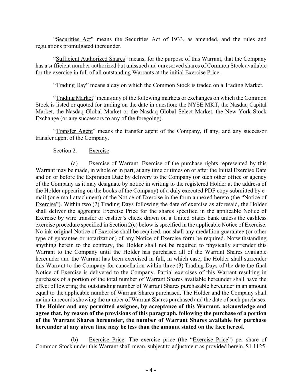 - 4 - “Securities Act” means the Securities Act of 1933, as amended, and the rules and regulations promulgated thereunder. “Sufficient Authorized Shares” means, for the purpose of this Warrant, that the Company has a sufficient number authorized but unissued and unreserved shares of Common Stock available for the exercise in full of all outstanding Warrants at the initial Exercise Price. “Trading Day” means a day on which the Common Stock is traded on a Trading Market. “Trading Market” means any of the following markets or exchanges on which the Common Stock is listed or quoted for trading on the date in question: the NYSE MKT, the Nasdaq Capital Market, the Nasdaq Global Market or the Nasdaq Global Select Market, the New York Stock Exchange (or any successors to any of the foregoing). “Transfer Agent” means the transfer agent of the Company, if any, and any successor transfer agent of the Company. Section 2. Exercise. (a) Exercise of Warrant. Exercise of the purchase rights represented by this Warrant may be made, in whole or in part, at any time or times on or after the Initial Exercise Date and on or before the Expiration Date by delivery to the Company (or such other office or agency of the Company as it may designate by notice in writing to the registered Holder at the address of the Holder appearing on the books of the Company) of a duly executed PDF copy submitted by e- mail (or e-mail attachment) of the Notice of Exercise in the form annexed hereto (the “Notice of Exercise”). Within two (2) Trading Days following the date of exercise as aforesaid, the Holder shall deliver the aggregate Exercise Price for the shares specified in the applicable Notice of Exercise by wire transfer or cashier’s check drawn on a United States bank unless the cashless exercise procedure specified in Section 2(c) below is specified in the applicable Notice of Exercise. No ink-original Notice of Exercise shall be required, nor shall any medallion guarantee (or other type of guarantee or notarization) of any Notice of Exercise form be required. Notwithstanding anything herein to the contrary, the Holder shall not be required to physically surrender this Warrant to the Company until the Holder has purchased all of the Warrant Shares available hereunder and the Warrant has been exercised in full, in which case, the Holder shall surrender this Warrant to the Company for cancellation within three (3) Trading Days of the date the final Notice of Exercise is delivered to the Company. Partial exercises of this Warrant resulting in purchases of a portion of the total number of Warrant Shares available hereunder shall have the effect of lowering the outstanding number of Warrant Shares purchasable hereunder in an amount equal to the applicable number of Warrant Shares purchased. The Holder and the Company shall maintain records showing the number of Warrant Shares purchased and the date of such purchases. The Holder and any permitted assignee, by acceptance of this Warrant, acknowledge and agree that, by reason of the provisions of this paragraph, following the purchase of a portion of the Warrant Shares hereunder, the number of Warrant Shares available for purchase hereunder at any given time may be less than the amount stated on the face hereof. (b) Exercise Price. The exercise price (the “Exercise Price”) per share of Common Stock under this Warrant shall mean, subject to adjustment as provided herein, $1.1125.