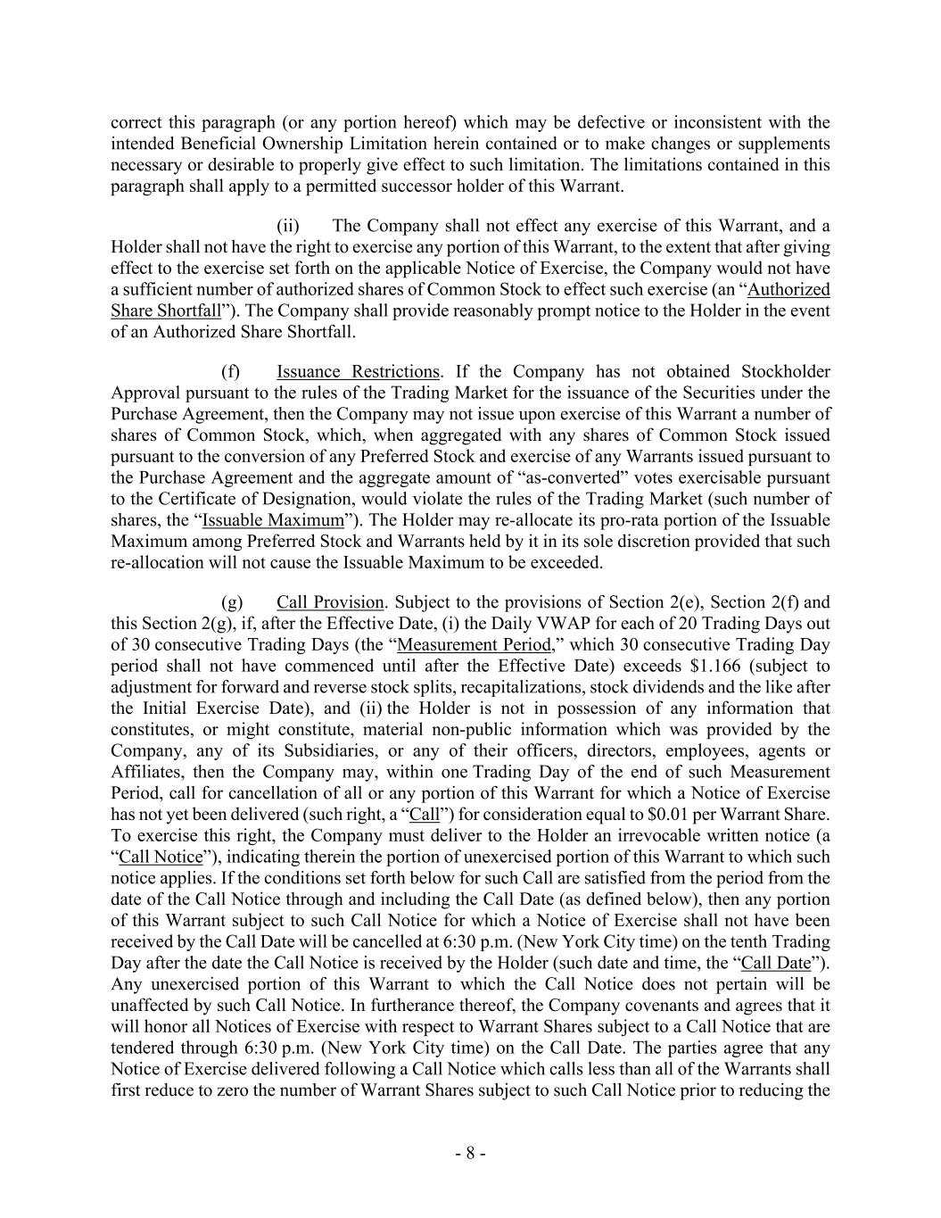 - 8 - correct this paragraph (or any portion hereof) which may be defective or inconsistent with the intended Beneficial Ownership Limitation herein contained or to make changes or supplements necessary or desirable to properly give effect to such limitation. The limitations contained in this paragraph shall apply to a permitted successor holder of this Warrant. (ii) The Company shall not effect any exercise of this Warrant, and a Holder shall not have the right to exercise any portion of this Warrant, to the extent that after giving effect to the exercise set forth on the applicable Notice of Exercise, the Company would not have a sufficient number of authorized shares of Common Stock to effect such exercise (an “Authorized Share Shortfall”). The Company shall provide reasonably prompt notice to the Holder in the event of an Authorized Share Shortfall. (f) Issuance Restrictions. If the Company has not obtained Stockholder Approval pursuant to the rules of the Trading Market for the issuance of the Securities under the Purchase Agreement, then the Company may not issue upon exercise of this Warrant a number of shares of Common Stock, which, when aggregated with any shares of Common Stock issued pursuant to the conversion of any Preferred Stock and exercise of any Warrants issued pursuant to the Purchase Agreement and the aggregate amount of “as-converted” votes exercisable pursuant to the Certificate of Designation, would violate the rules of the Trading Market (such number of shares, the “Issuable Maximum”). The Holder may re-allocate its pro-rata portion of the Issuable Maximum among Preferred Stock and Warrants held by it in its sole discretion provided that such re-allocation will not cause the Issuable Maximum to be exceeded. (g) Call Provision. Subject to the provisions of Section 2(e), Section 2(f) and this Section 2(g), if, after the Effective Date, (i) the Daily VWAP for each of 20 Trading Days out of 30 consecutive Trading Days (the “Measurement Period,” which 30 consecutive Trading Day period shall not have commenced until after the Effective Date) exceeds $1.166 (subject to adjustment for forward and reverse stock splits, recapitalizations, stock dividends and the like after the Initial Exercise Date), and (ii) the Holder is not in possession of any information that constitutes, or might constitute, material non-public information which was provided by the Company, any of its Subsidiaries, or any of their officers, directors, employees, agents or Affiliates, then the Company may, within one Trading Day of the end of such Measurement Period, call for cancellation of all or any portion of this Warrant for which a Notice of Exercise has not yet been delivered (such right, a “Call”) for consideration equal to $0.01 per Warrant Share. To exercise this right, the Company must deliver to the Holder an irrevocable written notice (a “Call Notice”), indicating therein the portion of unexercised portion of this Warrant to which such notice applies. If the conditions set forth below for such Call are satisfied from the period from the date of the Call Notice through and including the Call Date (as defined below), then any portion of this Warrant subject to such Call Notice for which a Notice of Exercise shall not have been received by the Call Date will be cancelled at 6:30 p.m. (New York City time) on the tenth Trading Day after the date the Call Notice is received by the Holder (such date and time, the “Call Date”). Any unexercised portion of this Warrant to which the Call Notice does not pertain will be unaffected by such Call Notice. In furtherance thereof, the Company covenants and agrees that it will honor all Notices of Exercise with respect to Warrant Shares subject to a Call Notice that are tendered through 6:30 p.m. (New York City time) on the Call Date. The parties agree that any Notice of Exercise delivered following a Call Notice which calls less than all of the Warrants shall first reduce to zero the number of Warrant Shares subject to such Call Notice prior to reducing the
