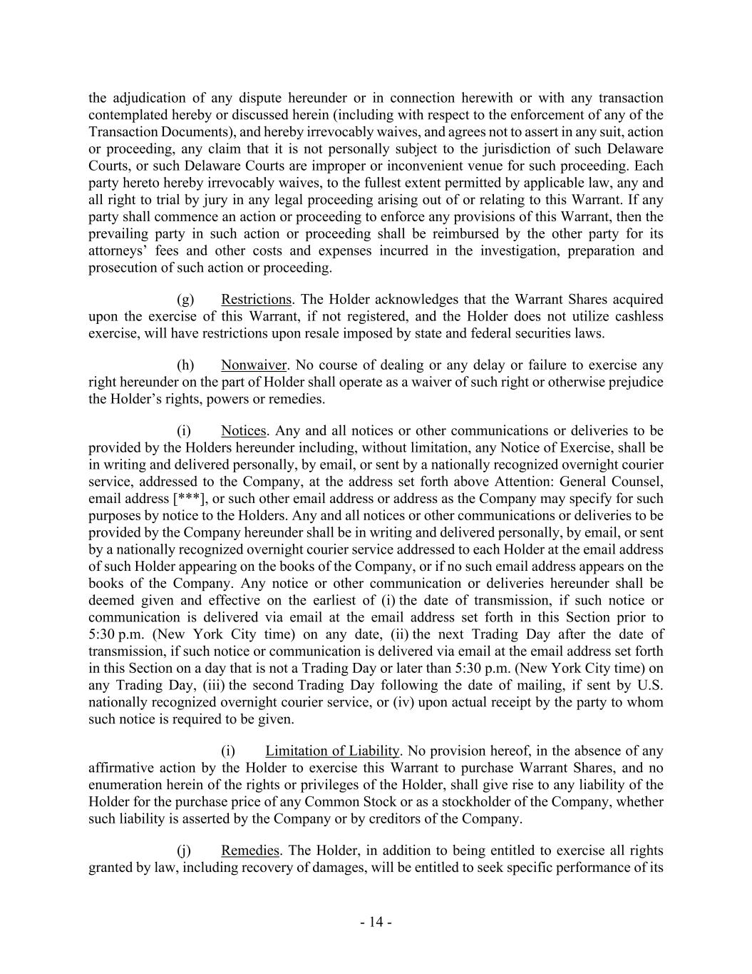 - 14 - the adjudication of any dispute hereunder or in connection herewith or with any transaction contemplated hereby or discussed herein (including with respect to the enforcement of any of the Transaction Documents), and hereby irrevocably waives, and agrees not to assert in any suit, action or proceeding, any claim that it is not personally subject to the jurisdiction of such Delaware Courts, or such Delaware Courts are improper or inconvenient venue for such proceeding. Each party hereto hereby irrevocably waives, to the fullest extent permitted by applicable law, any and all right to trial by jury in any legal proceeding arising out of or relating to this Warrant. If any party shall commence an action or proceeding to enforce any provisions of this Warrant, then the prevailing party in such action or proceeding shall be reimbursed by the other party for its attorneys’ fees and other costs and expenses incurred in the investigation, preparation and prosecution of such action or proceeding. (g) Restrictions. The Holder acknowledges that the Warrant Shares acquired upon the exercise of this Warrant, if not registered, and the Holder does not utilize cashless exercise, will have restrictions upon resale imposed by state and federal securities laws. (h) Nonwaiver. No course of dealing or any delay or failure to exercise any right hereunder on the part of Holder shall operate as a waiver of such right or otherwise prejudice the Holder’s rights, powers or remedies. (i) Notices. Any and all notices or other communications or deliveries to be provided by the Holders hereunder including, without limitation, any Notice of Exercise, shall be in writing and delivered personally, by email, or sent by a nationally recognized overnight courier service, addressed to the Company, at the address set forth above Attention: General Counsel, email address [***], or such other email address or address as the Company may specify for such purposes by notice to the Holders. Any and all notices or other communications or deliveries to be provided by the Company hereunder shall be in writing and delivered personally, by email, or sent by a nationally recognized overnight courier service addressed to each Holder at the email address of such Holder appearing on the books of the Company, or if no such email address appears on the books of the Company. Any notice or other communication or deliveries hereunder shall be deemed given and effective on the earliest of (i) the date of transmission, if such notice or communication is delivered via email at the email address set forth in this Section prior to 5:30 p.m. (New York City time) on any date, (ii) the next Trading Day after the date of transmission, if such notice or communication is delivered via email at the email address set forth in this Section on a day that is not a Trading Day or later than 5:30 p.m. (New York City time) on any Trading Day, (iii) the second Trading Day following the date of mailing, if sent by U.S. nationally recognized overnight courier service, or (iv) upon actual receipt by the party to whom such notice is required to be given. (i) Limitation of Liability. No provision hereof, in the absence of any affirmative action by the Holder to exercise this Warrant to purchase Warrant Shares, and no enumeration herein of the rights or privileges of the Holder, shall give rise to any liability of the Holder for the purchase price of any Common Stock or as a stockholder of the Company, whether such liability is asserted by the Company or by creditors of the Company. (j) Remedies. The Holder, in addition to being entitled to exercise all rights granted by law, including recovery of damages, will be entitled to seek specific performance of its