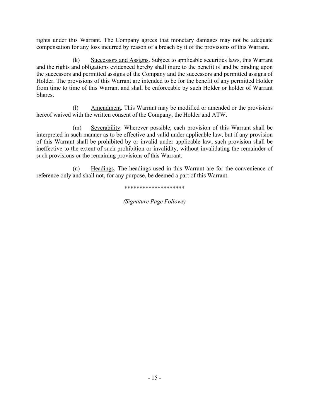 - 15 - rights under this Warrant. The Company agrees that monetary damages may not be adequate compensation for any loss incurred by reason of a breach by it of the provisions of this Warrant. (k) Successors and Assigns. Subject to applicable securities laws, this Warrant and the rights and obligations evidenced hereby shall inure to the benefit of and be binding upon the successors and permitted assigns of the Company and the successors and permitted assigns of Holder. The provisions of this Warrant are intended to be for the benefit of any permitted Holder from time to time of this Warrant and shall be enforceable by such Holder or holder of Warrant Shares. (l) Amendment. This Warrant may be modified or amended or the provisions hereof waived with the written consent of the Company, the Holder and ATW. (m) Severability. Wherever possible, each provision of this Warrant shall be interpreted in such manner as to be effective and valid under applicable law, but if any provision of this Warrant shall be prohibited by or invalid under applicable law, such provision shall be ineffective to the extent of such prohibition or invalidity, without invalidating the remainder of such provisions or the remaining provisions of this Warrant. (n) Headings. The headings used in this Warrant are for the convenience of reference only and shall not, for any purpose, be deemed a part of this Warrant. ******************** (Signature Page Follows)