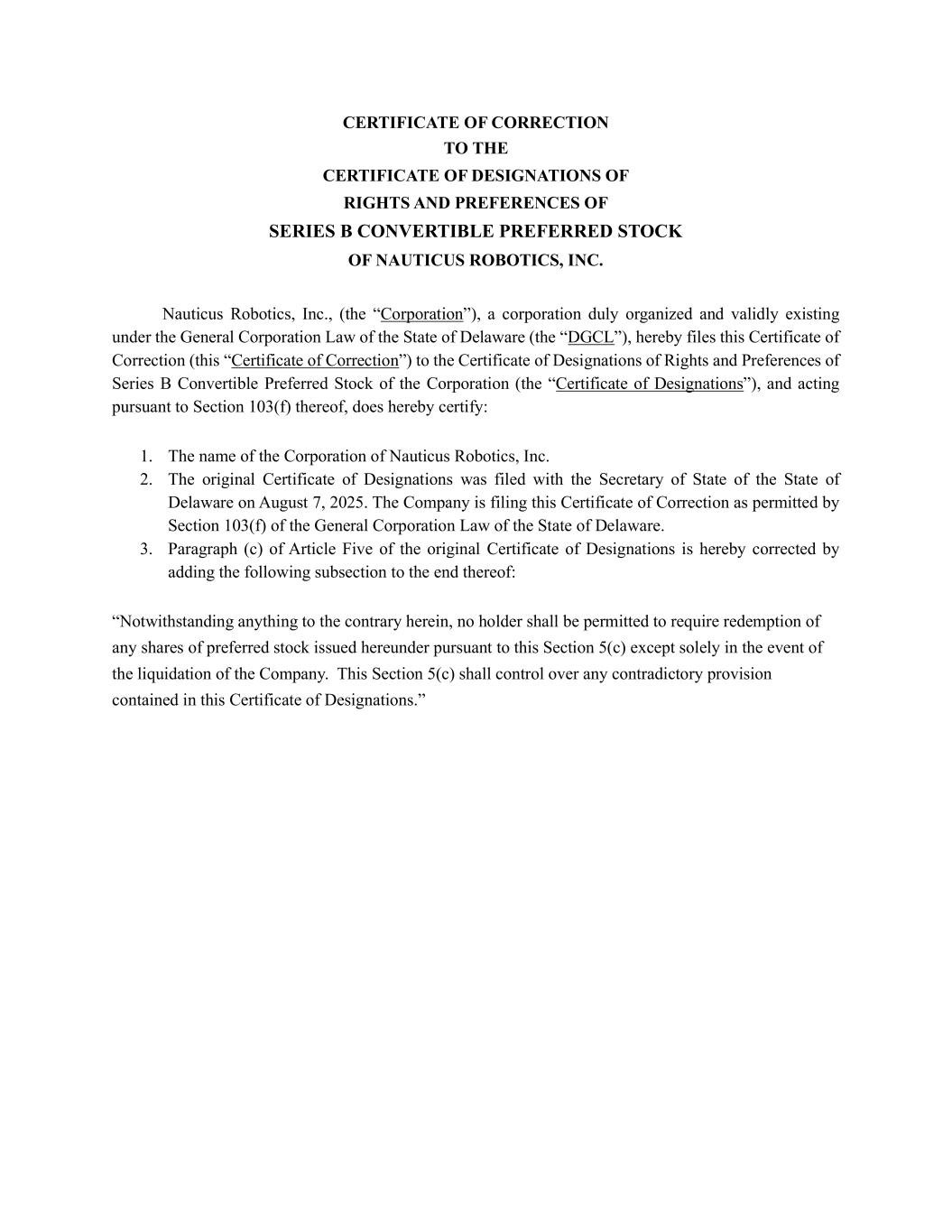 CERTIFICATE OF CORRECTION TO THE CERTIFICATE OF DESIGNATIONS OF RIGHTS AND PREFERENCES OF SERIES B CONVERTIBLE PREFERRED STOCK OF NAUTICUS ROBOTICS, INC. Nauticus Robotics, Inc., (the “Corporation”), a corporation duly organized and validly existing under the General Corporation Law of the State of Delaware (the “DGCL”), hereby files this Certificate of Correction (this “Certificate of Correction”) to the Certificate of Designations of Rights and Preferences of Series B Convertible Preferred Stock of the Corporation (the “Certificate of Designations”), and acting pursuant to Section 103(f) thereof, does hereby certify: 1. The name of the Corporation of Nauticus Robotics, Inc. 2. The original Certificate of Designations was filed with the Secretary of State of the State of Delaware on August 7, 2025. The Company is filing this Certificate of Correction as permitted by Section 103(f) of the General Corporation Law of the State of Delaware. 3. Paragraph (c) of Article Five of the original Certificate of Designations is hereby corrected by adding the following subsection to the end thereof: “Notwithstanding anything to the contrary herein, no holder shall be permitted to require redemption of any shares of preferred stock issued hereunder pursuant to this Section 5(c) except solely in the event of the liquidation of the Company. This Section 5(c) shall control over any contradictory provision contained in this Certificate of Designations.”