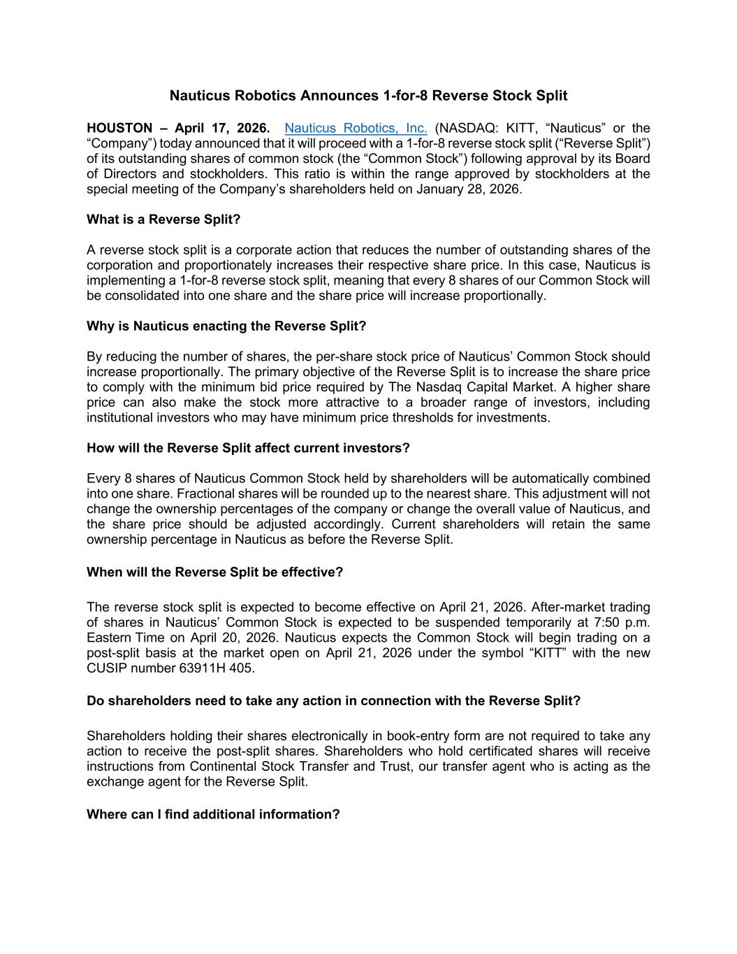 Nauticus Robotics Announces 1-for-8 Reverse Stock Split HOUSTON – April 17, 2026. Nauticus Robotics, Inc. (NASDAQ: KITT, “Nauticus” or the “Company”) today announced that it will proceed with a 1-for-8 reverse stock split (“Reverse Split”) of its outstanding shares of common stock (the “Common Stock”) following approval by its Board of Directors and stockholders. This ratio is within the range approved by stockholders at the special meeting of the Company’s shareholders held on January 28, 2026. What is a Reverse Split? A reverse stock split is a corporate action that reduces the number of outstanding shares of the corporation and proportionately increases their respective share price. In this case, Nauticus is implementing a 1-for-8 reverse stock split, meaning that every 8 shares of our Common Stock will be consolidated into one share and the share price will increase proportionally. Why is Nauticus enacting the Reverse Split? By reducing the number of shares, the per-share stock price of Nauticus’ Common Stock should increase proportionally. The primary objective of the Reverse Split is to increase the share price to comply with the minimum bid price required by The Nasdaq Capital Market. A higher share price can also make the stock more attractive to a broader range of investors, including institutional investors who may have minimum price thresholds for investments. How will the Reverse Split affect current investors? Every 8 shares of Nauticus Common Stock held by shareholders will be automatically combined into one share. Fractional shares will be rounded up to the nearest share. This adjustment will not change the ownership percentages of the company or change the overall value of Nauticus, and the share price should be adjusted accordingly. Current shareholders will retain the same ownership percentage in Nauticus as before the Reverse Split. When will the Reverse Split be effective? The reverse stock split is expected to become effective on April 21, 2026. After-market trading of shares in Nauticus’ Common Stock is expected to be suspended temporarily at 7:50 p.m. Eastern Time on April 20, 2026. Nauticus expects the Common Stock will begin trading on a post-split basis at the market open on April 21, 2026 under the symbol “KITT” with the new CUSIP number 63911H 405. Do shareholders need to take any action in connection with the Reverse Split? Shareholders holding their shares electronically in book-entry form are not required to take any action to receive the post-split shares. Shareholders who hold certificated shares will receive instructions from Continental Stock Transfer and Trust, our transfer agent who is acting as the exchange agent for the Reverse Split. Where can I find additional information?
