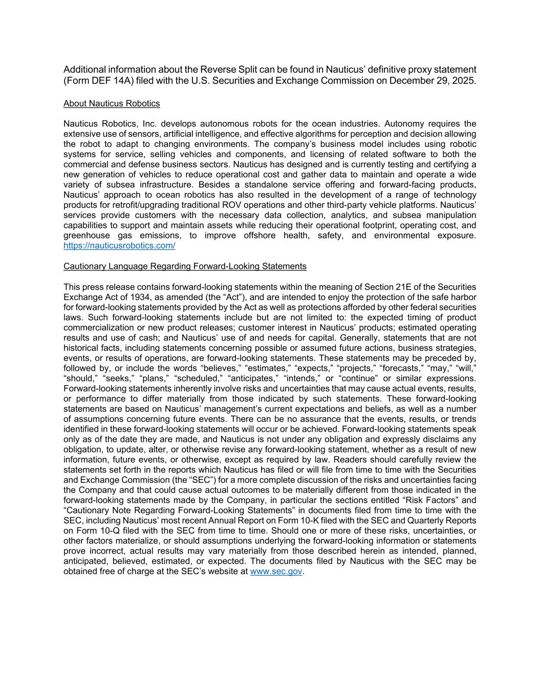 Additional information about the Reverse Split can be found in Nauticus’ definitive proxy statement (Form DEF 14A) filed with the U.S. Securities and Exchange Commission on December 29, 2025. About Nauticus Robotics Nauticus Robotics, Inc. develops autonomous robots for the ocean industries. Autonomy requires the extensive use of sensors, artificial intelligence, and effective algorithms for perception and decision allowing the robot to adapt to changing environments. The company’s business model includes using robotic systems for service, selling vehicles and components, and licensing of related software to both the commercial and defense business sectors. Nauticus has designed and is currently testing and certifying a new generation of vehicles to reduce operational cost and gather data to maintain and operate a wide variety of subsea infrastructure. Besides a standalone service offering and forward-facing products, Nauticus’ approach to ocean robotics has also resulted in the development of a range of technology products for retrofit/upgrading traditional ROV operations and other third-party vehicle platforms. Nauticus’ services provide customers with the necessary data collection, analytics, and subsea manipulation capabilities to support and maintain assets while reducing their operational footprint, operating cost, and greenhouse gas emissions, to improve offshore health, safety, and environmental exposure. https://nauticusrobotics.com/ Cautionary Language Regarding Forward-Looking Statements This press release contains forward-looking statements within the meaning of Section 21E of the Securities Exchange Act of 1934, as amended (the “Act”), and are intended to enjoy the protection of the safe harbor for forward-looking statements provided by the Act as well as protections afforded by other federal securities laws. Such forward-looking statements include but are not limited to: the expected timing of product commercialization or new product releases; customer interest in Nauticus’ products; estimated operating results and use of cash; and Nauticus’ use of and needs for capital. Generally, statements that are not historical facts, including statements concerning possible or assumed future actions, business strategies, events, or results of operations, are forward-looking statements. These statements may be preceded by, followed by, or include the words “believes,” “estimates,” “expects,” “projects,” “forecasts,” “may,” “will,” “should,” “seeks,” “plans,” “scheduled,” “anticipates,” “intends,” or “continue” or similar expressions. Forward-looking statements inherently involve risks and uncertainties that may cause actual events, results, or performance to differ materially from those indicated by such statements. These forward-looking statements are based on Nauticus’ management’s current expectations and beliefs, as well as a number of assumptions concerning future events. There can be no assurance that the events, results, or trends identified in these forward-looking statements will occur or be achieved. Forward-looking statements speak only as of the date they are made, and Nauticus is not under any obligation and expressly disclaims any obligation, to update, alter, or otherwise revise any forward-looking statement, whether as a result of new information, future events, or otherwise, except as required by law. Readers should carefully review the statements set forth in the reports which Nauticus has filed or will file from time to time with the Securities and Exchange Commission (the “SEC”) for a more complete discussion of the risks and uncertainties facing the Company and that could cause actual outcomes to be materially different from those indicated in the forward-looking statements made by the Company, in particular the sections entitled “Risk Factors” and “Cautionary Note Regarding Forward-Looking Statements” in documents filed from time to time with the SEC, including Nauticus’ most recent Annual Report on Form 10-K filed with the SEC and Quarterly Reports on Form 10-Q filed with the SEC from time to time. Should one or more of these risks, uncertainties, or other factors materialize, or should assumptions underlying the forward-looking information or statements prove incorrect, actual results may vary materially from those described herein as intended, planned, anticipated, believed, estimated, or expected. The documents filed by Nauticus with the SEC may be obtained free of charge at the SEC’s website at www.sec.gov.