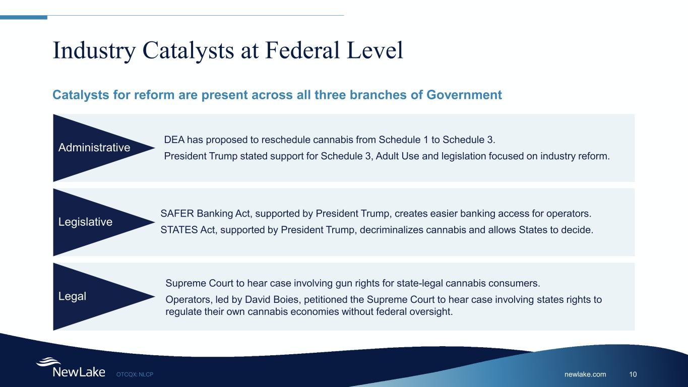 newlake.comOTCQX: NLCP 10 Industry Catalysts at Federal Level Legislative SAFER Banking Act, supported by President Trump, creates easier banking access for operators. STATES Act, supported by President Trump, decriminalizes cannabis and allows States to decide. Administrative DEA has proposed to reschedule cannabis from Schedule 1 to Schedule 3. President Trump stated support for Schedule 3, Adult Use and legislation focused on industry reform. Legal Supreme Court to hear case involving gun rights for state-legal cannabis consumers. Operators, led by David Boies, petitioned the Supreme Court to hear case involving states rights to regulate their own cannabis economies without federal oversight. Catalysts for reform are present across all three branches of Government