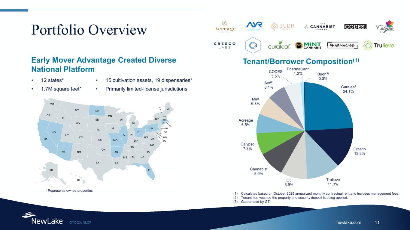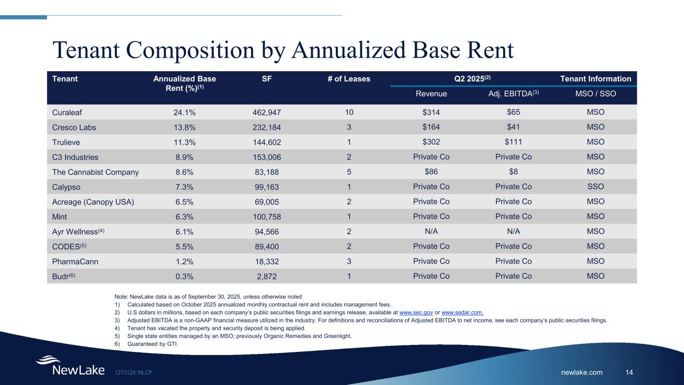 newlake.comOTCQX: NLCP 14 Tenant Composition by Annualized Base Rent Tenant Annualized Base Rent (%)(1) SF # of Leases Q2 2025(2) Tenant Information Revenue Adj. EBITDA(3) MSO / SSO Curaleaf 24.1% 462,947 10 $314 $65 MSO Cresco Labs 13.8% 232,184 3 $164 $41 MSO Trulieve 11.3% 144,602 1 $302 $111 MSO C3 Industries 8.9% 153,006 2 Private Co Private Co MSO The Cannabist Company 8.6% 83,188 5 $86 $8 MSO Calypso 7.3% 99,163 1 Private Co Private Co SSO Acreage (Canopy USA) 6.5% 69,005 2 Private Co Private Co MSO Mint 6.3% 100,758 1 Private Co Private Co MSO Ayr Wellness(4) 6.1% 94,566 2 N/A N/A MSO CODES(5) 5.5% 89,400 2 Private Co Private Co MSO PharmaCann 1.2% 18,332 3 Private Co Private Co MSO Budr(6) 0.3% 2,872 1 Private Co Private Co MSO Note: NewLake data is as of September 30, 2025, unless otherwise noted 1) Calculated based on October 2025 annualized monthly contractual rent and includes management fees. 2) U.S dollars in millions, based on each company’s public securities filings and earnings release, available at www.sec.gov or www.sedar.com. 3) Adjusted EBITDA is a non-GAAP financial measure utilized in the industry. For definitions and reconciliations of Adjusted EBITDA to net income, see each company’s public securities filings. 4) Tenant has vacated the property and security deposit is being applied. 5) Single state entities managed by an MSO; previously Organic Remedies and Greenlight. 6) Guaranteed by GTI.
