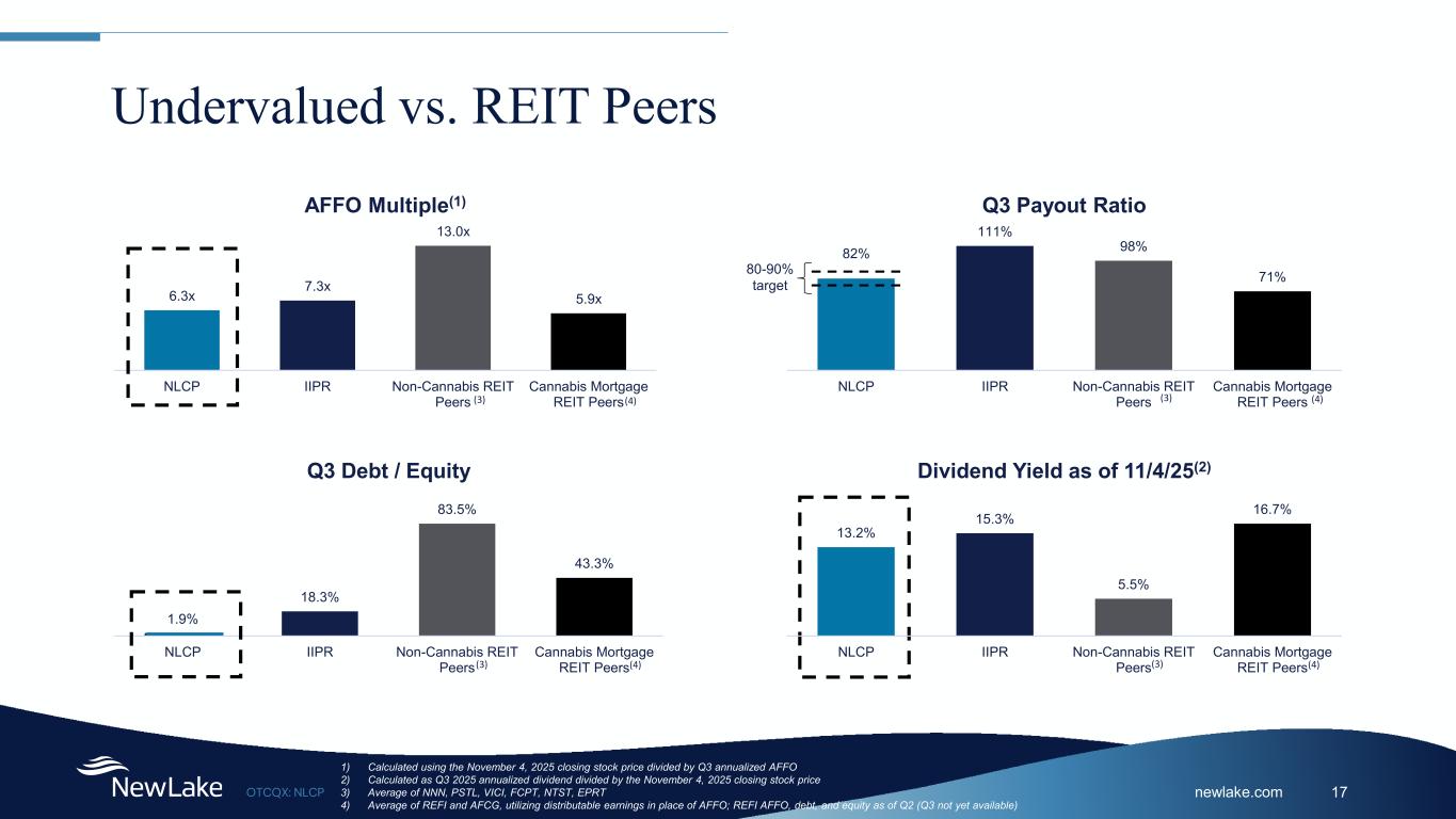 newlake.comOTCQX: NLCP 16 Financial Overview Stockholders’ Equity $391 Million Invested & Committed Capital $435 Million Cash $24 Million Debt $8 Million Market Capitalization1 $268 Million Stock Price1 $13.02 Dividend Yield2 13.2% Common Shares Outstanding 20,552,632 Book Value per share $19.01 3Q25 Annualized Dividend3 $1.72 Target AFFO Payout Ratio 80% - 90% 3Q25 Revenue Annualized4 $50.3 Million G&A Expense Ratio Annualized5 1.2% Key Data Dividend Growth per Share Note: Data is as of September 30, 2025, unless otherwise noted 1 Based on the Nov 4, 2025, closing price. 2 Calculated as Q3 2025 annualized dividend divided by the Nov 4, 2025, closing stock price. 3 Annualized based on Q3 2025 dividend of $0.43 per common share, declared on September 12, 2025. 4 Annualized revenue is calculated using actual revenue for the three months ended September 30, 2025. 5 Calculated using annualized General and Administrative Expense, excluding stock-based compensation, for the three months ending September 30, 2025, over Total Assets as of September 30, 2025. $0.43 $0.43 $0.43 $0.43 $0.43 $0.43 $0.41 $0.40 $0.39 $0.39 $0.39 $0.39 $0.37 $0.35 $0.33 $0.31 3Q25 2Q25 1Q25 4Q24 3Q24 2Q24 1Q24 4Q23 3Q23 2Q23 1Q23 4Q22 3Q22 2Q22 1Q22 4Q21