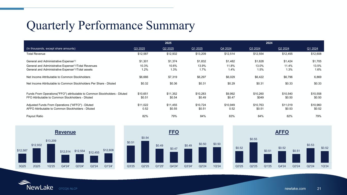 newlake.comOTCQX: NLCP 21 Quarterly Performance Summary 2025 2024 (In thousands, except share amounts) Q3 2025 Q2 2025 Q1 2025 Q4 2024 Q3 2024 Q2 2024 Q1 2024 Total Revenue $12,587 $12,932 $13,209 $12,514 $12,554 $12,455 $12,608 General and Administrative Expense(1) $1,301 $1,374 $1,832 $1,482 $1,628 $1,424 $1,705 General and Administrative Expense(1)/Total Revenues 10.3% 10.6% 13.9% 11.8% 13.0% 11.4% 13.5% General and Administrative Expense(1)/Total assets 1.2% 1.3% 1.7% 1.4% 1.5% 1.3% 1.6% Net Income Attributable to Common Stockholders $6,666 $7,319 $6,297 $6,029 $6,422 $6,796 6,869 Net Income Attributable to Common Stockholders Per Share - Diluted $0.32 $0.36 $0.31 $0.29 $0.31 $0.33 $0.33 Funds From Operations("FFO") attributable to Common Stockholders - Diluted $10,651 $11,352 $10,283 $9,992 $10,260 $10,540 $10,558 FFO Attributable to Common Stockholders - Diluted $0.51 $0.54 $0.49 $0.47 $049 $0.50 $0.50 Adjusted Funds From Operations ("AFFO") - Diluted $11,022 $11,455 $10,724 $10,949 $10,763 $11,019 $10,960 AFFO Attributable to Common Stockholders - Diluted 0.52 $0.55 $0.51 0.52 $0.51 $0.53 $0.52 Payout Ratio 82% 79% 84% 83% 84% 82% 79% $12,587 $12,932 $13,209 $12,514 $12,554 $12,455 $12,608 3Q25 2Q25 1Q'25 Q4'24' Q3'24' Q2'24 Q1'24' Revenue $0.52 $0.55 $0.51 $0.52 $0.51 $0.53 $0.52 Q3'25 Q2'25 Q1'25 Q4'24 Q3'24 Q2'24 1Q'24 AFFO $0.51 $0.54 $0.49 $0.47 $0.49 $0.50 $0.50 Q3'25 Q2'25 Q1'25' Q4'24' Q3'24' Q2'24 1Q'24 FFO