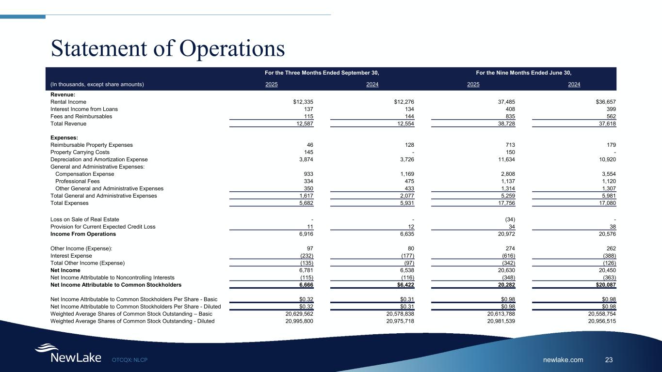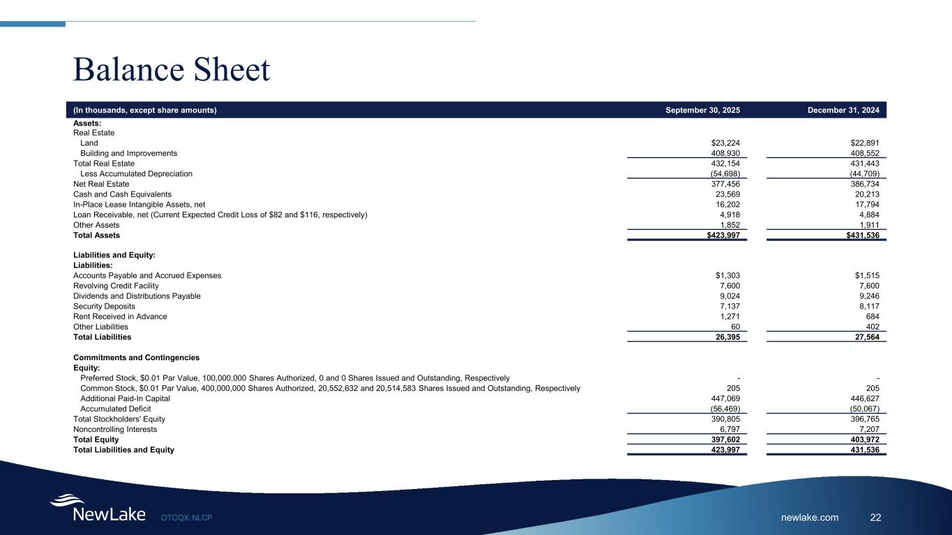 newlake.comOTCQX: NLCP 22 Balance Sheet (In thousands, except share amounts) September 30, 2025 December 31, 2024 Assets: Real Estate Land $23,224 $22,891 Building and Improvements 408,930 408,552 Total Real Estate 432,154 431,443 Less Accumulated Depreciation (54,698) (44,709) Net Real Estate 377,456 386,734 Cash and Cash Equivalents 23,569 20,213 In-Place Lease Intangible Assets, net 16,202 17,794 Loan Receivable, net (Current Expected Credit Loss of $82 and $116, respectively) 4,918 4,884 Other Assets 1,852 1,911 Total Assets $423,997 $431,536 Liabilities and Equity: Liabilities: Accounts Payable and Accrued Expenses $1,303 $1,515 Revolving Credit Facility 7,600 7,600 Dividends and Distributions Payable 9,024 9,246 Security Deposits 7,137 8,117 Rent Received in Advance 1,271 684 Other Liabilities 60 402 Total Liabilities 26,395 27,564 Commitments and Contingencies Equity: Preferred Stock, $0.01 Par Value, 100,000,000 Shares Authorized, 0 and 0 Shares Issued and Outstanding, Respectively - - Common Stock, $0.01 Par Value, 400,000,000 Shares Authorized, 20,552,632 and 20,514,583 Shares Issued and Outstanding, Respectively 205 205 Additional Paid-In Capital 447,069 446,627 Accumulated Deficit (56,469) (50,067) Total Stockholders' Equity 390,805 396,765 Noncontrolling Interests 6,797 7,207 Total Equity 397,602 403,972 Total Liabilities and Equity 423,997 431,536