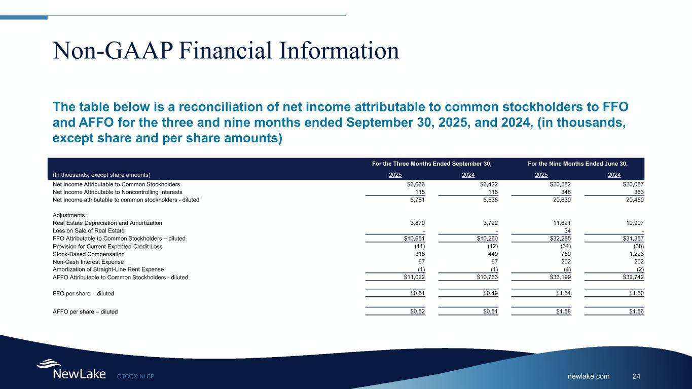 newlake.comOTCQX: NLCP 23 Statement of Operations For the Three Months Ended September 30, For the Nine Months Ended June 30, (In thousands, except share amounts) 2025 2024 2025 2024 Revenue: Rental Income $12,335 $12,276 37,485 $36,657 Interest Income from Loans 137 134 408 399 Fees and Reimbursables 115 144 835 562 Total Revenue 12,587 12,554 38,728 37,618 Expenses: Reimbursable Property Expenses 46 128 713 179 Property Carrying Costs 145 - 150 - Depreciation and Amortization Expense 3,874 3,726 11,634 10,920 General and Administrative Expenses: Compensation Expense 933 1,169 2,808 3,554 Professional Fees 334 475 1,137 1,120 Other General and Administrative Expenses 350 433 1,314 1,307 Total General and Administrative Expenses 1,617 2,077 5,259 5,981 Total Expenses 5,682 5,931 17,756 17,080 Loss on Sale of Real Estate - - (34) - Provision for Current Expected Credit Loss 11 12 34 38 Income From Operations 6,916 6,635 20,972 20,576 Other Income (Expense): 97 80 274 262 Interest Expense (232) (177) (616) (388) Total Other Income (Expense) (135) (97) (342) (126) Net Income 6,781 6,538 20,630 20,450 Net Income Attributable to Noncontrolling Interests (115) (116) (348) (363) Net Income Attributable to Common Stockholders 6,666 $6,422 20,282 $20,087 Net Income Attributable to Common Stockholders Per Share - Basic $0.32 $0.31 $0.98 $0.98 Net Income Attributable to Common Stockholders Per Share - Diluted $0.32 $0.31 $0.98 $0.98 Weighted Average Shares of Common Stock Outstanding – Basic 20,629,562 20,578,838 20,613,788 20,558,754 Weighted Average Shares of Common Stock Outstanding - Diluted 20,995,800 20,975,718 20,981,539 20,956,515