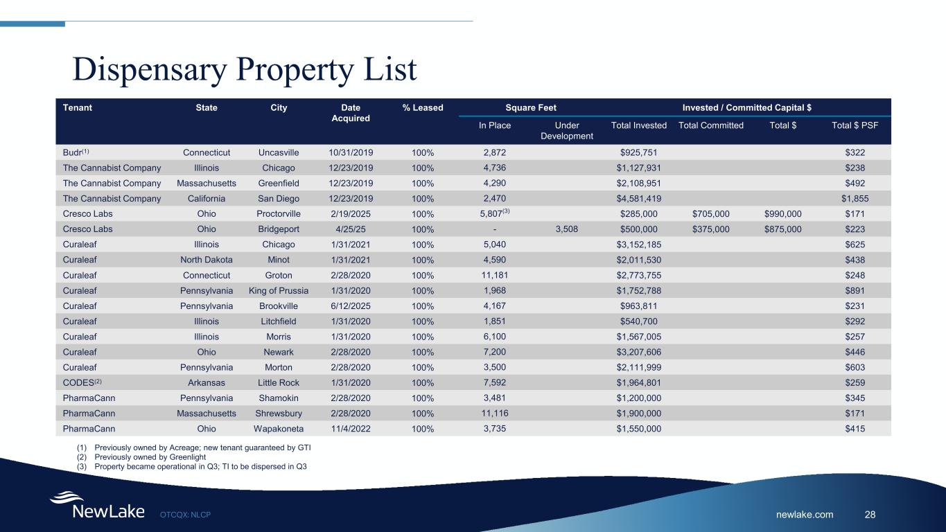 newlake.comOTCQX: NLCP 28 Dispensary Property List Tenant State City Date Acquired % Leased Square Feet Invested / Committed Capital $ In Place Under Development Total Invested Total Committed Total $ Total $ PSF Budr(1) Connecticut Uncasville 10/31/2019 100% 2,872 $925,751 $322 The Cannabist Company Illinois Chicago 12/23/2019 100% 4,736 $1,127,931 $238 The Cannabist Company Massachusetts Greenfield 12/23/2019 100% 4,290 $2,108,951 $492 The Cannabist Company California San Diego 12/23/2019 100% 2,470 $4,581,419 $1,855 Cresco Labs Ohio Proctorville 2/19/2025 100% 5,807(3) $285,000 $705,000 $990,000 $171 Cresco Labs Ohio Bridgeport 4/25/25 100% - 3,508 $500,000 $375,000 $875,000 $223 Curaleaf Illinois Chicago 1/31/2021 100% 5,040 $3,152,185 $625 Curaleaf North Dakota Minot 1/31/2021 100% 4,590 $2,011,530 $438 Curaleaf Connecticut Groton 2/28/2020 100% 11,181 $2,773,755 $248 Curaleaf Pennsylvania King of Prussia 1/31/2020 100% 1,968 $1,752,788 $891 Curaleaf Pennsylvania Brookville 6/12/2025 100% 4,167 $963,811 $231 Curaleaf Illinois Litchfield 1/31/2020 100% 1,851 $540,700 $292 Curaleaf Illinois Morris 1/31/2020 100% 6,100 $1,567,005 $257 Curaleaf Ohio Newark 2/28/2020 100% 7,200 $3,207,606 $446 Curaleaf Pennsylvania Morton 2/28/2020 100% 3,500 $2,111,999 $603 CODES(2) Arkansas Little Rock 1/31/2020 100% 7,592 $1,964,801 $259 PharmaCann Pennsylvania Shamokin 2/28/2020 100% 3,481 $1,200,000 $345 PharmaCann Massachusetts Shrewsbury 2/28/2020 100% 11,116 $1,900,000 $171 PharmaCann Ohio Wapakoneta 11/4/2022 100% 3,735 $1,550,000 $415 (1) Previously owned by Acreage; new tenant guaranteed by GTI (2) Previously owned by Greenlight (3) Property became operational in Q3; TI to be dispersed in Q3