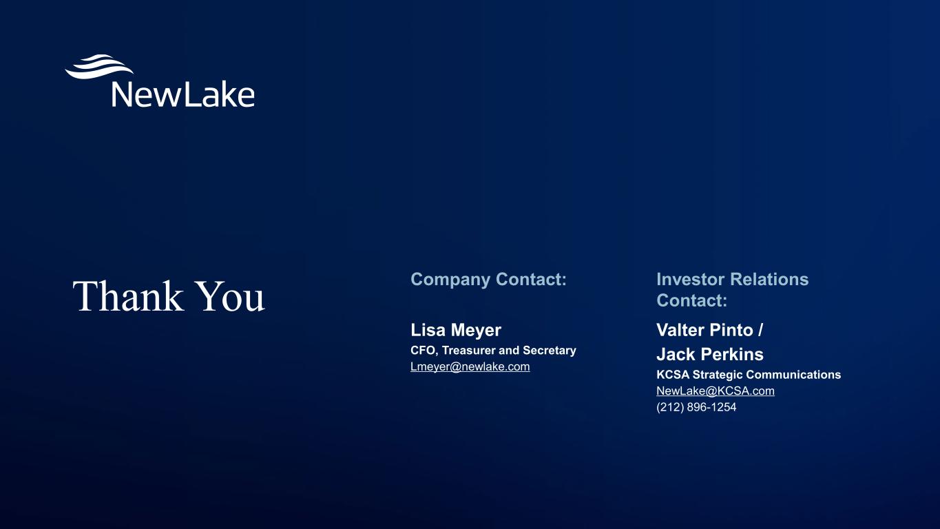 Thank You Company Contact: Lisa Meyer CFO, Treasurer and Secretary Lmeyer@newlake.com Investor Relations Contact: Valter Pinto / Jack Perkins KCSA Strategic Communications NewLake@KCSA.com (212) 896-1254