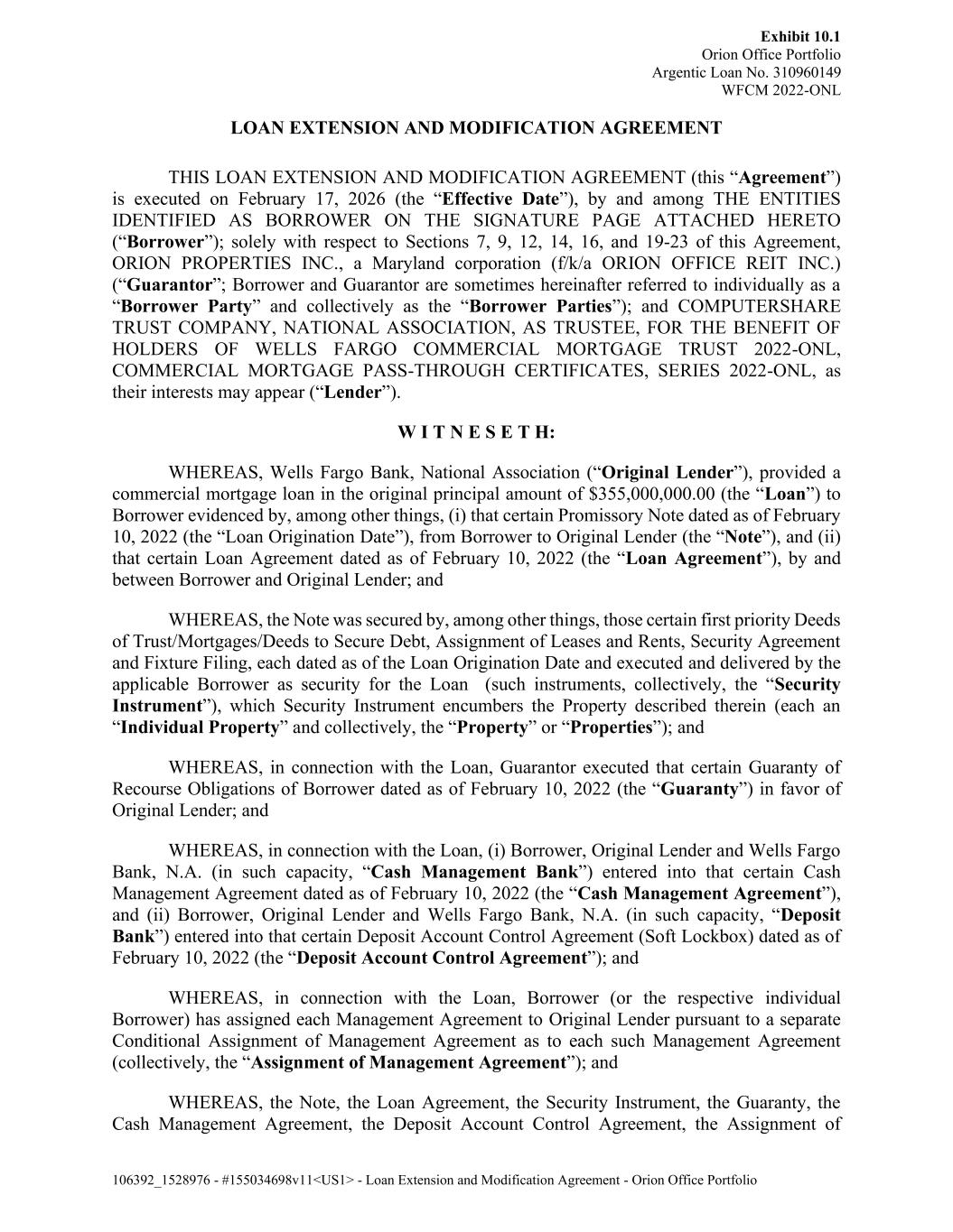 Orion Office Portfolio Argentic Loan No. 310960149 WFCM 2022-ONL 106392_1528976 - #155034698v11<US1> - Loan Extension and Modification Agreement - Orion Office Portfolio LOAN EXTENSION AND MODIFICATION AGREEMENT THIS LOAN EXTENSION AND MODIFICATION AGREEMENT (this “Agreement”) is executed on February 17, 2026 (the “Effective Date”), by and among THE ENTITIES IDENTIFIED AS BORROWER ON THE SIGNATURE PAGE ATTACHED HERETO (“Borrower”); solely with respect to Sections 7, 9, 12, 14, 16, and 19-23 of this Agreement, ORION PROPERTIES INC., a Maryland corporation (f/k/a ORION OFFICE REIT INC.) (“Guarantor”; Borrower and Guarantor are sometimes hereinafter referred to individually as a “Borrower Party” and collectively as the “Borrower Parties”); and COMPUTERSHARE TRUST COMPANY, NATIONAL ASSOCIATION, AS TRUSTEE, FOR THE BENEFIT OF HOLDERS OF WELLS FARGO COMMERCIAL MORTGAGE TRUST 2022-ONL, COMMERCIAL MORTGAGE PASS-THROUGH CERTIFICATES, SERIES 2022-ONL, as their interests may appear (“Lender”). W I T N E S E T H: WHEREAS, Wells Fargo Bank, National Association (“Original Lender”), provided a commercial mortgage loan in the original principal amount of $355,000,000.00 (the “Loan”) to Borrower evidenced by, among other things, (i) that certain Promissory Note dated as of February 10, 2022 (the “Loan Origination Date”), from Borrower to Original Lender (the “Note”), and (ii) that certain Loan Agreement dated as of February 10, 2022 (the “Loan Agreement”), by and between Borrower and Original Lender; and WHEREAS, the Note was secured by, among other things, those certain first priority Deeds of Trust/Mortgages/Deeds to Secure Debt, Assignment of Leases and Rents, Security Agreement and Fixture Filing, each dated as of the Loan Origination Date and executed and delivered by the applicable Borrower as security for the Loan (such instruments, collectively, the “Security Instrument”), which Security Instrument encumbers the Property described therein (each an “Individual Property” and collectively, the “Property” or “Properties”); and WHEREAS, in connection with the Loan, Guarantor executed that certain Guaranty of Recourse Obligations of Borrower dated as of February 10, 2022 (the “Guaranty”) in favor of Original Lender; and WHEREAS, in connection with the Loan, (i) Borrower, Original Lender and Wells Fargo Bank, N.A. (in such capacity, “Cash Management Bank”) entered into that certain Cash Management Agreement dated as of February 10, 2022 (the “Cash Management Agreement”), and (ii) Borrower, Original Lender and Wells Fargo Bank, N.A. (in such capacity, “Deposit Bank”) entered into that certain Deposit Account Control Agreement (Soft Lockbox) dated as of February 10, 2022 (the “Deposit Account Control Agreement”); and WHEREAS, in connection with the Loan, Borrower (or the respective individual Borrower) has assigned each Management Agreement to Original Lender pursuant to a separate Conditional Assignment of Management Agreement as to each such Management Agreement (collectively, the “Assignment of Management Agreement”); and WHEREAS, the Note, the Loan Agreement, the Security Instrument, the Guaranty, the Cash Management Agreement, the Deposit Account Control Agreement, the Assignment of Exhibit 10.1