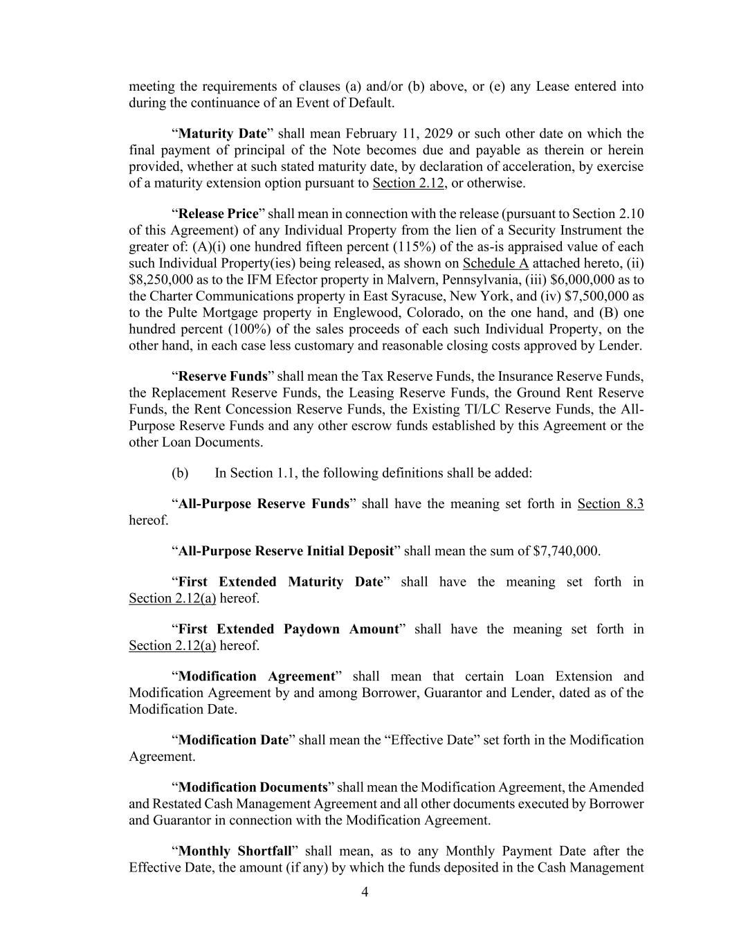 4 meeting the requirements of clauses (a) and/or (b) above, or (e) any Lease entered into during the continuance of an Event of Default. “Maturity Date” shall mean February 11, 2029 or such other date on which the final payment of principal of the Note becomes due and payable as therein or herein provided, whether at such stated maturity date, by declaration of acceleration, by exercise of a maturity extension option pursuant to Section 2.12, or otherwise. “Release Price” shall mean in connection with the release (pursuant to Section 2.10 of this Agreement) of any Individual Property from the lien of a Security Instrument the greater of: (A)(i) one hundred fifteen percent (115%) of the as-is appraised value of each such Individual Property(ies) being released, as shown on Schedule A attached hereto, (ii) $8,250,000 as to the IFM Efector property in Malvern, Pennsylvania, (iii) $6,000,000 as to the Charter Communications property in East Syracuse, New York, and (iv) $7,500,000 as to the Pulte Mortgage property in Englewood, Colorado, on the one hand, and (B) one hundred percent (100%) of the sales proceeds of each such Individual Property, on the other hand, in each case less customary and reasonable closing costs approved by Lender. “Reserve Funds” shall mean the Tax Reserve Funds, the Insurance Reserve Funds, the Replacement Reserve Funds, the Leasing Reserve Funds, the Ground Rent Reserve Funds, the Rent Concession Reserve Funds, the Existing TI/LC Reserve Funds, the All- Purpose Reserve Funds and any other escrow funds established by this Agreement or the other Loan Documents. (b) In Section 1.1, the following definitions shall be added: “All-Purpose Reserve Funds” shall have the meaning set forth in Section 8.3 hereof. “All-Purpose Reserve Initial Deposit” shall mean the sum of $7,740,000. “First Extended Maturity Date” shall have the meaning set forth in Section 2.12(a) hereof. “First Extended Paydown Amount” shall have the meaning set forth in Section 2.12(a) hereof. “Modification Agreement” shall mean that certain Loan Extension and Modification Agreement by and among Borrower, Guarantor and Lender, dated as of the Modification Date. “Modification Date” shall mean the “Effective Date” set forth in the Modification Agreement. “Modification Documents” shall mean the Modification Agreement, the Amended and Restated Cash Management Agreement and all other documents executed by Borrower and Guarantor in connection with the Modification Agreement. “Monthly Shortfall” shall mean, as to any Monthly Payment Date after the Effective Date, the amount (if any) by which the funds deposited in the Cash Management