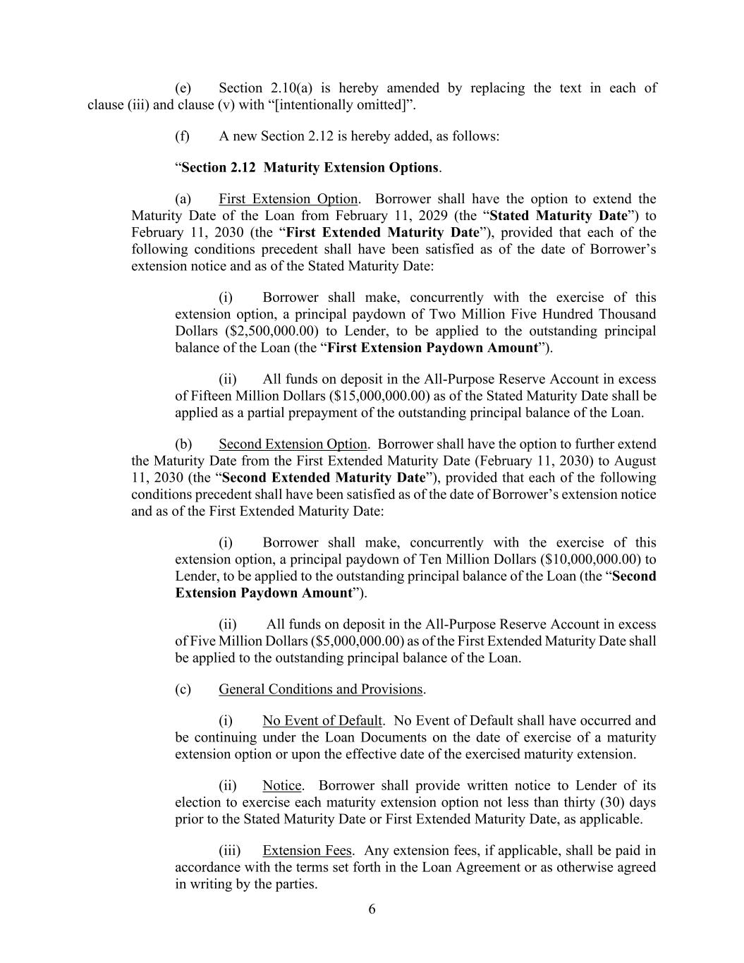 6 (e) Section 2.10(a) is hereby amended by replacing the text in each of clause (iii) and clause (v) with “[intentionally omitted]”. (f) A new Section 2.12 is hereby added, as follows: “Section 2.12 Maturity Extension Options. (a) First Extension Option. Borrower shall have the option to extend the Maturity Date of the Loan from February 11, 2029 (the “Stated Maturity Date”) to February 11, 2030 (the “First Extended Maturity Date”), provided that each of the following conditions precedent shall have been satisfied as of the date of Borrower’s extension notice and as of the Stated Maturity Date: (i) Borrower shall make, concurrently with the exercise of this extension option, a principal paydown of Two Million Five Hundred Thousand Dollars ($2,500,000.00) to Lender, to be applied to the outstanding principal balance of the Loan (the “First Extension Paydown Amount”). (ii) All funds on deposit in the All-Purpose Reserve Account in excess of Fifteen Million Dollars ($15,000,000.00) as of the Stated Maturity Date shall be applied as a partial prepayment of the outstanding principal balance of the Loan. (b) Second Extension Option. Borrower shall have the option to further extend the Maturity Date from the First Extended Maturity Date (February 11, 2030) to August 11, 2030 (the “Second Extended Maturity Date”), provided that each of the following conditions precedent shall have been satisfied as of the date of Borrower’s extension notice and as of the First Extended Maturity Date: (i) Borrower shall make, concurrently with the exercise of this extension option, a principal paydown of Ten Million Dollars ($10,000,000.00) to Lender, to be applied to the outstanding principal balance of the Loan (the “Second Extension Paydown Amount”). (ii) All funds on deposit in the All-Purpose Reserve Account in excess of Five Million Dollars ($5,000,000.00) as of the First Extended Maturity Date shall be applied to the outstanding principal balance of the Loan. (c) General Conditions and Provisions. (i) No Event of Default. No Event of Default shall have occurred and be continuing under the Loan Documents on the date of exercise of a maturity extension option or upon the effective date of the exercised maturity extension. (ii) Notice. Borrower shall provide written notice to Lender of its election to exercise each maturity extension option not less than thirty (30) days prior to the Stated Maturity Date or First Extended Maturity Date, as applicable. (iii) Extension Fees. Any extension fees, if applicable, shall be paid in accordance with the terms set forth in the Loan Agreement or as otherwise agreed in writing by the parties.