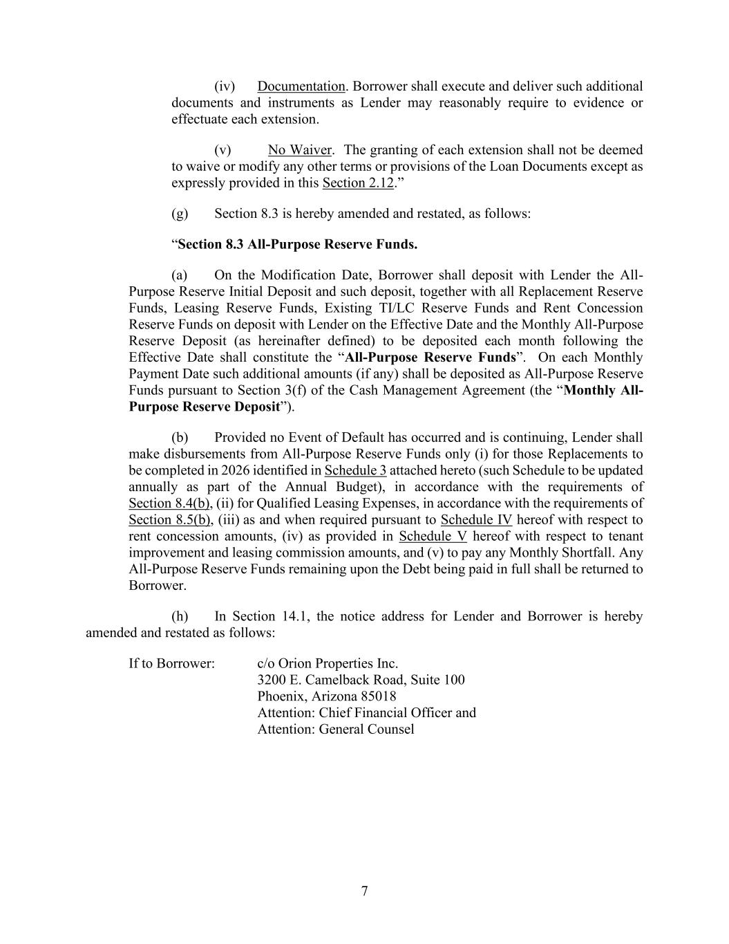 7 (iv) Documentation. Borrower shall execute and deliver such additional documents and instruments as Lender may reasonably require to evidence or effectuate each extension. (v) No Waiver. The granting of each extension shall not be deemed to waive or modify any other terms or provisions of the Loan Documents except as expressly provided in this Section 2.12.” (g) Section 8.3 is hereby amended and restated, as follows: “Section 8.3 All-Purpose Reserve Funds. (a) On the Modification Date, Borrower shall deposit with Lender the All- Purpose Reserve Initial Deposit and such deposit, together with all Replacement Reserve Funds, Leasing Reserve Funds, Existing TI/LC Reserve Funds and Rent Concession Reserve Funds on deposit with Lender on the Effective Date and the Monthly All-Purpose Reserve Deposit (as hereinafter defined) to be deposited each month following the Effective Date shall constitute the “All-Purpose Reserve Funds”. On each Monthly Payment Date such additional amounts (if any) shall be deposited as All-Purpose Reserve Funds pursuant to Section 3(f) of the Cash Management Agreement (the “Monthly All- Purpose Reserve Deposit”). (b) Provided no Event of Default has occurred and is continuing, Lender shall make disbursements from All-Purpose Reserve Funds only (i) for those Replacements to be completed in 2026 identified in Schedule 3 attached hereto (such Schedule to be updated annually as part of the Annual Budget), in accordance with the requirements of Section 8.4(b), (ii) for Qualified Leasing Expenses, in accordance with the requirements of Section 8.5(b), (iii) as and when required pursuant to Schedule IV hereof with respect to rent concession amounts, (iv) as provided in Schedule V hereof with respect to tenant improvement and leasing commission amounts, and (v) to pay any Monthly Shortfall. Any All-Purpose Reserve Funds remaining upon the Debt being paid in full shall be returned to Borrower. (h) In Section 14.1, the notice address for Lender and Borrower is hereby amended and restated as follows: If to Borrower: c/o Orion Properties Inc. 3200 E. Camelback Road, Suite 100 Phoenix, Arizona 85018 Attention: Chief Financial Officer and Attention: General Counsel