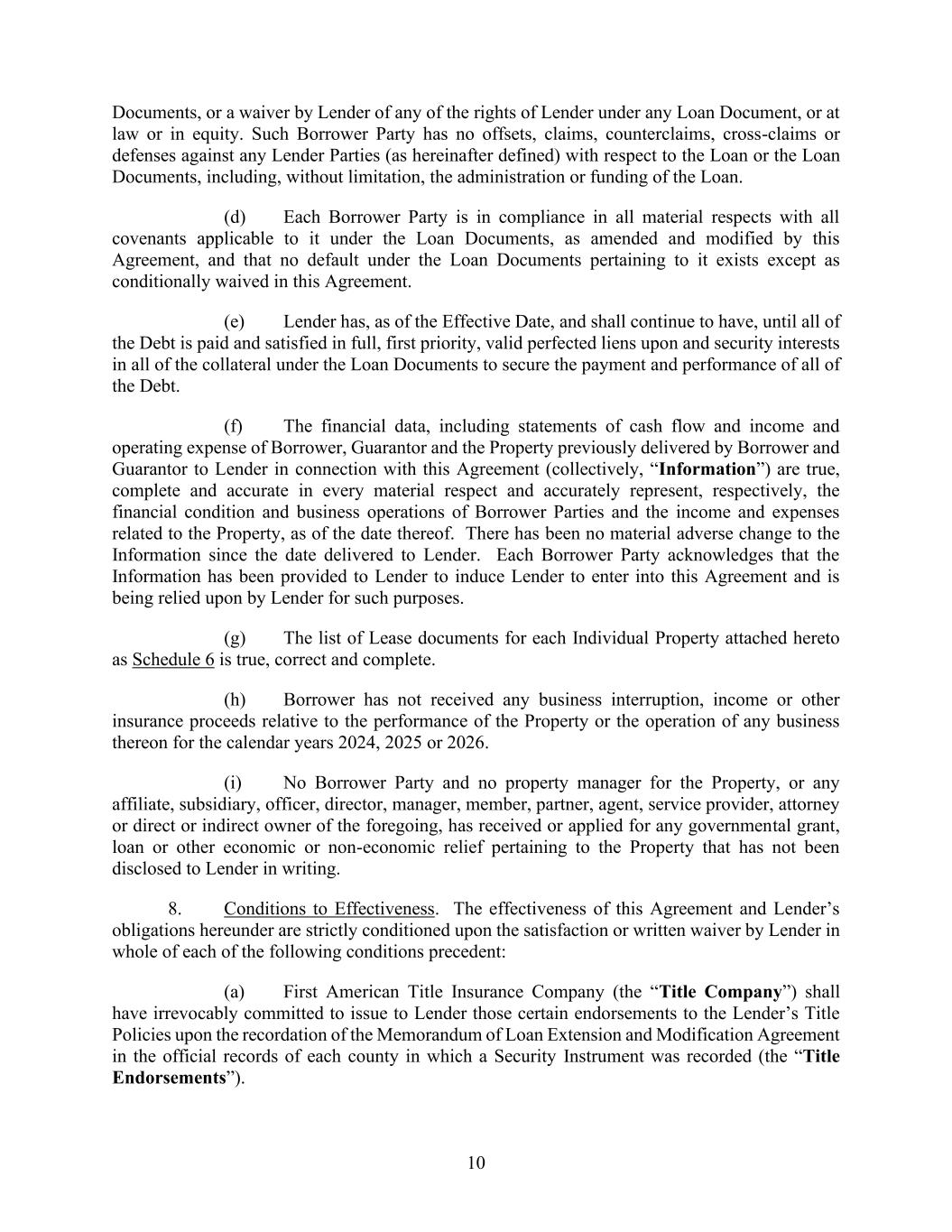 10 Documents, or a waiver by Lender of any of the rights of Lender under any Loan Document, or at law or in equity. Such Borrower Party has no offsets, claims, counterclaims, cross-claims or defenses against any Lender Parties (as hereinafter defined) with respect to the Loan or the Loan Documents, including, without limitation, the administration or funding of the Loan. (d) Each Borrower Party is in compliance in all material respects with all covenants applicable to it under the Loan Documents, as amended and modified by this Agreement, and that no default under the Loan Documents pertaining to it exists except as conditionally waived in this Agreement. (e) Lender has, as of the Effective Date, and shall continue to have, until all of the Debt is paid and satisfied in full, first priority, valid perfected liens upon and security interests in all of the collateral under the Loan Documents to secure the payment and performance of all of the Debt. (f) The financial data, including statements of cash flow and income and operating expense of Borrower, Guarantor and the Property previously delivered by Borrower and Guarantor to Lender in connection with this Agreement (collectively, “Information”) are true, complete and accurate in every material respect and accurately represent, respectively, the financial condition and business operations of Borrower Parties and the income and expenses related to the Property, as of the date thereof. There has been no material adverse change to the Information since the date delivered to Lender. Each Borrower Party acknowledges that the Information has been provided to Lender to induce Lender to enter into this Agreement and is being relied upon by Lender for such purposes. (g) The list of Lease documents for each Individual Property attached hereto as Schedule 6 is true, correct and complete. (h) Borrower has not received any business interruption, income or other insurance proceeds relative to the performance of the Property or the operation of any business thereon for the calendar years 2024, 2025 or 2026. (i) No Borrower Party and no property manager for the Property, or any affiliate, subsidiary, officer, director, manager, member, partner, agent, service provider, attorney or direct or indirect owner of the foregoing, has received or applied for any governmental grant, loan or other economic or non-economic relief pertaining to the Property that has not been disclosed to Lender in writing. 8. Conditions to Effectiveness. The effectiveness of this Agreement and Lender’s obligations hereunder are strictly conditioned upon the satisfaction or written waiver by Lender in whole of each of the following conditions precedent: (a) First American Title Insurance Company (the “Title Company”) shall have irrevocably committed to issue to Lender those certain endorsements to the Lender’s Title Policies upon the recordation of the Memorandum of Loan Extension and Modification Agreement in the official records of each county in which a Security Instrument was recorded (the “Title Endorsements”).