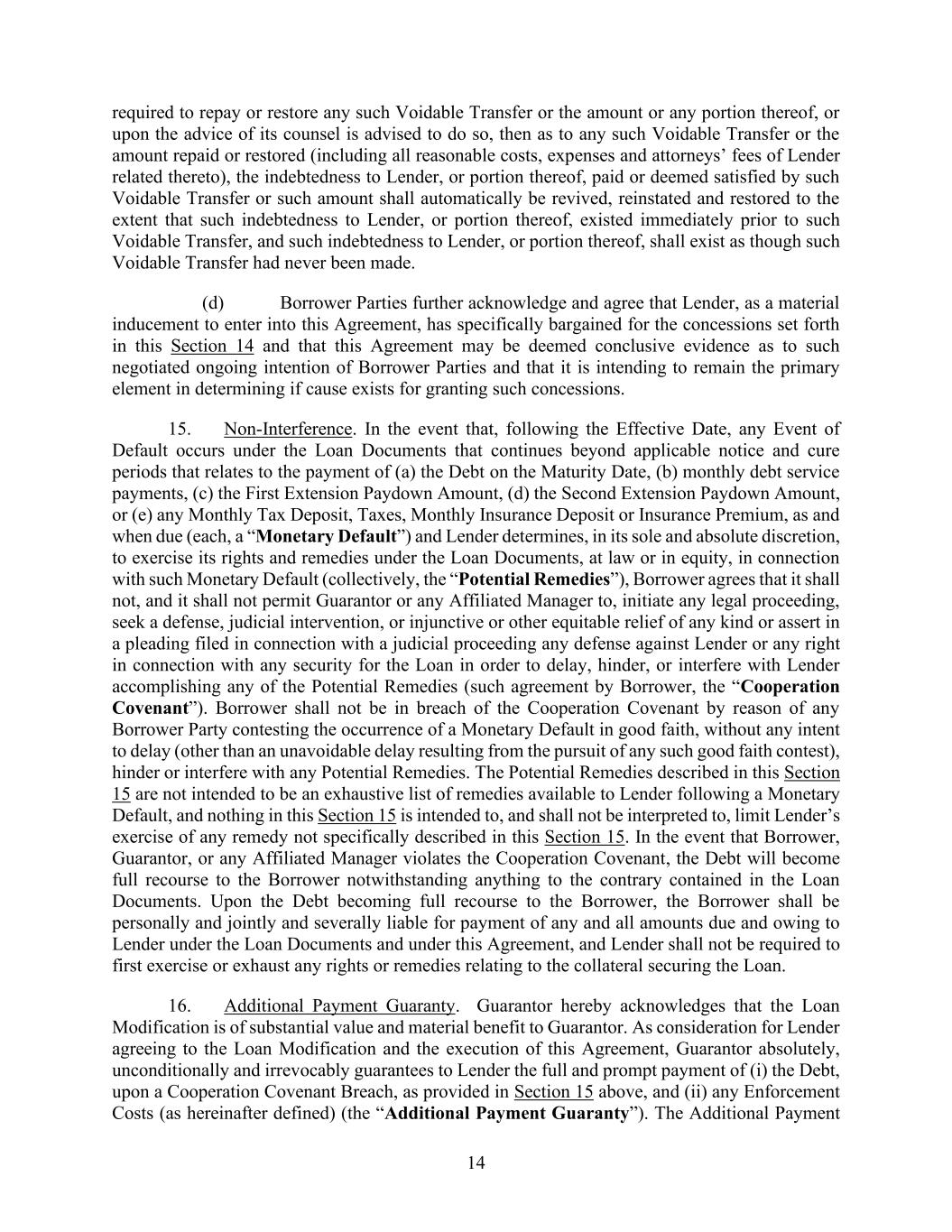 14 required to repay or restore any such Voidable Transfer or the amount or any portion thereof, or upon the advice of its counsel is advised to do so, then as to any such Voidable Transfer or the amount repaid or restored (including all reasonable costs, expenses and attorneys’ fees of Lender related thereto), the indebtedness to Lender, or portion thereof, paid or deemed satisfied by such Voidable Transfer or such amount shall automatically be revived, reinstated and restored to the extent that such indebtedness to Lender, or portion thereof, existed immediately prior to such Voidable Transfer, and such indebtedness to Lender, or portion thereof, shall exist as though such Voidable Transfer had never been made. (d) Borrower Parties further acknowledge and agree that Lender, as a material inducement to enter into this Agreement, has specifically bargained for the concessions set forth in this Section 14 and that this Agreement may be deemed conclusive evidence as to such negotiated ongoing intention of Borrower Parties and that it is intending to remain the primary element in determining if cause exists for granting such concessions. 15. Non-Interference. In the event that, following the Effective Date, any Event of Default occurs under the Loan Documents that continues beyond applicable notice and cure periods that relates to the payment of (a) the Debt on the Maturity Date, (b) monthly debt service payments, (c) the First Extension Paydown Amount, (d) the Second Extension Paydown Amount, or (e) any Monthly Tax Deposit, Taxes, Monthly Insurance Deposit or Insurance Premium, as and when due (each, a “Monetary Default”) and Lender determines, in its sole and absolute discretion, to exercise its rights and remedies under the Loan Documents, at law or in equity, in connection with such Monetary Default (collectively, the “Potential Remedies”), Borrower agrees that it shall not, and it shall not permit Guarantor or any Affiliated Manager to, initiate any legal proceeding, seek a defense, judicial intervention, or injunctive or other equitable relief of any kind or assert in a pleading filed in connection with a judicial proceeding any defense against Lender or any right in connection with any security for the Loan in order to delay, hinder, or interfere with Lender accomplishing any of the Potential Remedies (such agreement by Borrower, the “Cooperation Covenant”). Borrower shall not be in breach of the Cooperation Covenant by reason of any Borrower Party contesting the occurrence of a Monetary Default in good faith, without any intent to delay (other than an unavoidable delay resulting from the pursuit of any such good faith contest), hinder or interfere with any Potential Remedies. The Potential Remedies described in this Section 15 are not intended to be an exhaustive list of remedies available to Lender following a Monetary Default, and nothing in this Section 15 is intended to, and shall not be interpreted to, limit Lender’s exercise of any remedy not specifically described in this Section 15. In the event that Borrower, Guarantor, or any Affiliated Manager violates the Cooperation Covenant, the Debt will become full recourse to the Borrower notwithstanding anything to the contrary contained in the Loan Documents. Upon the Debt becoming full recourse to the Borrower, the Borrower shall be personally and jointly and severally liable for payment of any and all amounts due and owing to Lender under the Loan Documents and under this Agreement, and Lender shall not be required to first exercise or exhaust any rights or remedies relating to the collateral securing the Loan. 16. Additional Payment Guaranty. Guarantor hereby acknowledges that the Loan Modification is of substantial value and material benefit to Guarantor. As consideration for Lender agreeing to the Loan Modification and the execution of this Agreement, Guarantor absolutely, unconditionally and irrevocably guarantees to Lender the full and prompt payment of (i) the Debt, upon a Cooperation Covenant Breach, as provided in Section 15 above, and (ii) any Enforcement Costs (as hereinafter defined) (the “Additional Payment Guaranty”). The Additional Payment